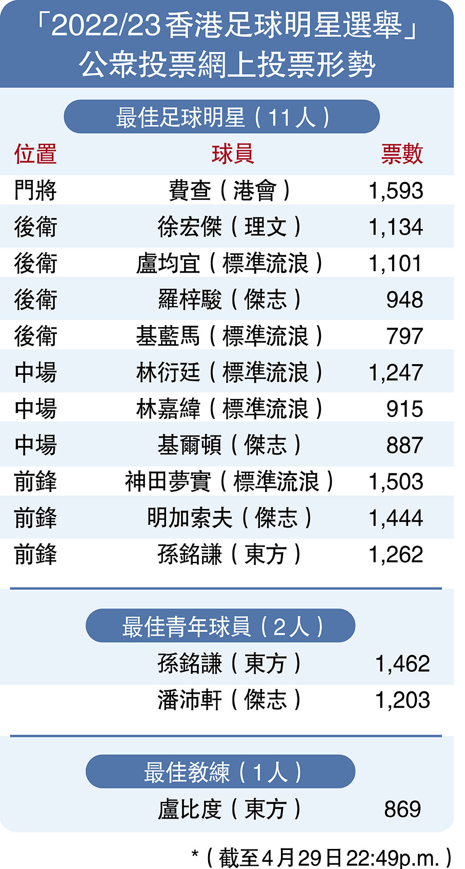 至於「最佳青年球員」方面,東方的孫銘謙與傑志的潘沛軒分別以1,462票及1,203票領先,拋離第3位的余在言約500票及300票。「最佳教練」則由東方的盧比度以869票排第1,但只些微領先傑志的朱志光35票,標準流浪教練團成員黃展鴻亦以801票排第3。
