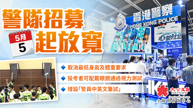 大公文匯全媒體報道,警務處今日(3日)宣布調整三項入職要求,以保持警隊在人力資源市場的競爭力,並進一步提升招聘效率。