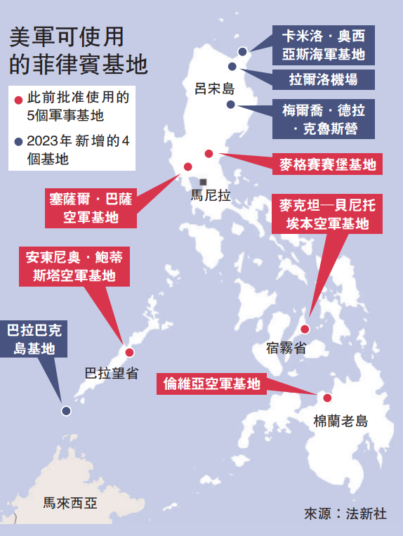馬科斯訪美之前,美菲剛剛完成有史以來規模最大的聯合軍事演習,兩國空軍還在菲律賓舉行了自1990年以來首次聯合戰鬥機訓練。上月初,菲政府公布了向美軍開放的4個新增軍事基地的具體位置,其中3個位於菲北部呂宋島,距離中國台灣地區最近僅約400公里;另一個位於菲西部巴拉望省巴拉巴克島,面向南海。