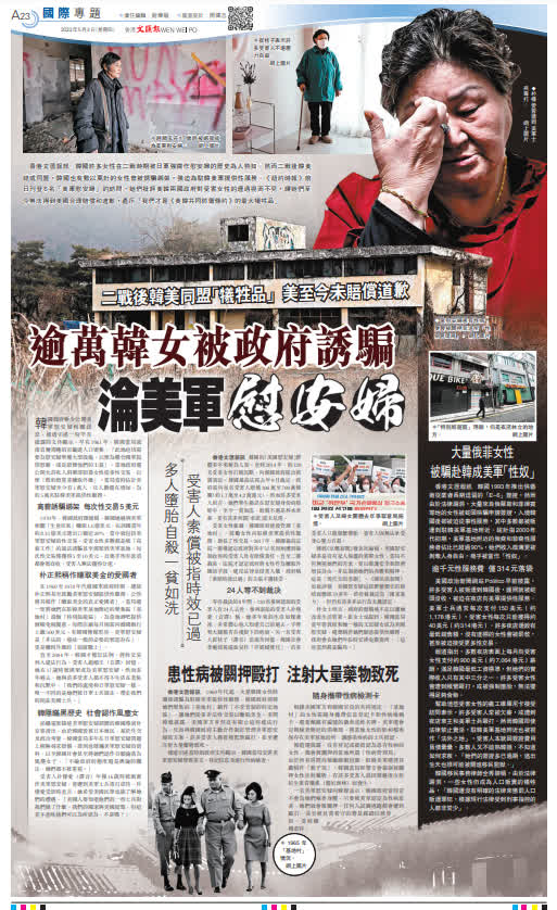韓國的「美國慰安婦」群體多年來鮮為人知。直到2014年,約120名受害女性打破沉默,向韓國政府提出賠償訴訟。韓國最高法院去年9月裁定,政府需向每名受害人賠償300萬至700萬韓圜(約1.7萬至4.2萬港元)。然而許多受害人坦言,她們畢生都活在慰安婦身份的陰影中,至今一貧如洗,賠償不過是杯水車薪,更有許多所謂「承諾」從未兌現。