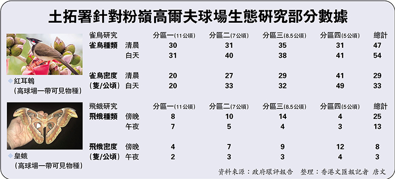 環諮會委員何敬豐則關注,土拓署的飛蛾調查與香港哥爾夫球會的飛蛾調查結果相距頗大,署方在兩個時段分別發現13種和25種飛蛾,但球會調查卻發現逾100種,質疑報告的合理性。土拓署代表指,兩項調查的目的和方法不同,球會是以盤點(inventory)為目的,收集時間較長,署方則旨在採樣(sampling),在指定時間內收集,故得出不同結果。