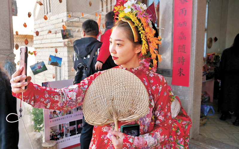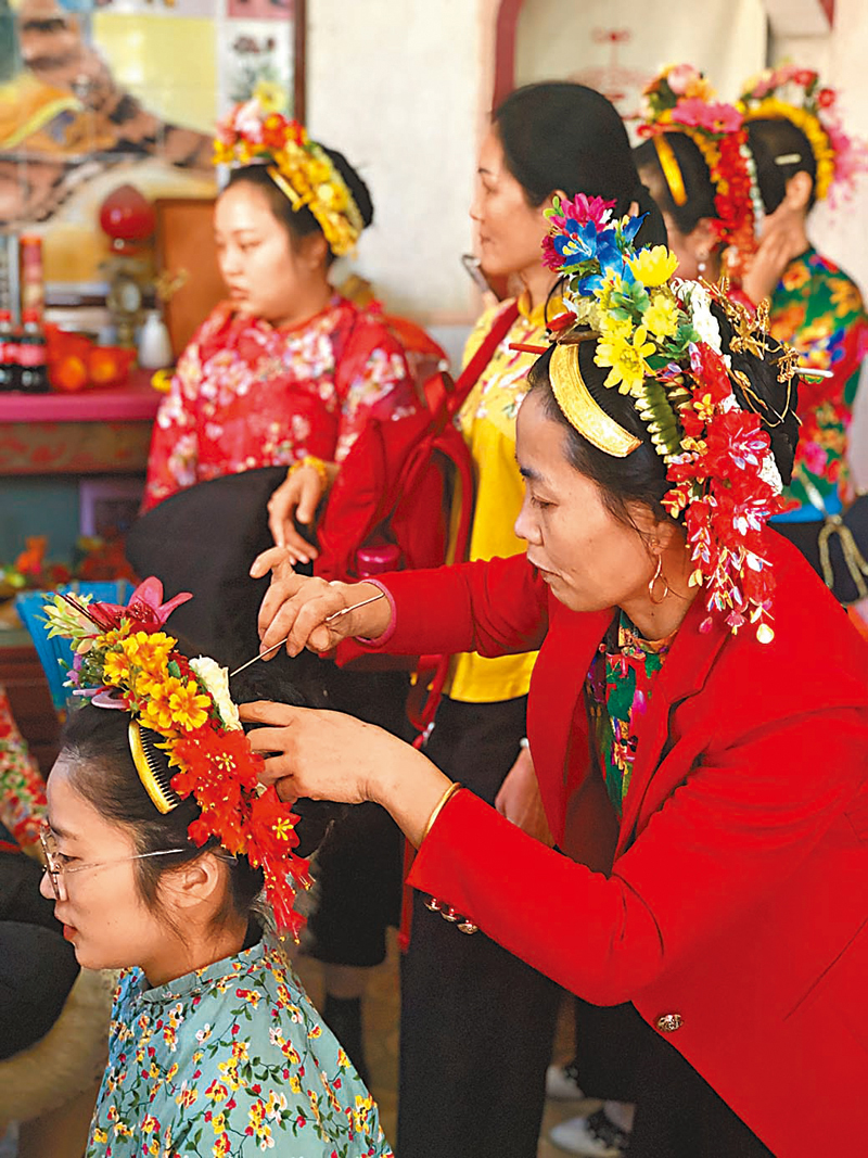 時逢春日,日麗風和,黃麗泳的梳頭工作室裏,體驗簪花圍的遊客將小小的空間圍得水洩不通。「我是廣西壯族人,梳好簪花圍後,還要學着她們的樣子挑着一擔鮮花去街上叫賣,到處走到處逛,拍『海的女兒』體驗照片」。」正在梳簪花圍頭的黃小姐說,蟳埔女這種裝飾與內地各少數民族的裝飾都迥然不同,很神奇。