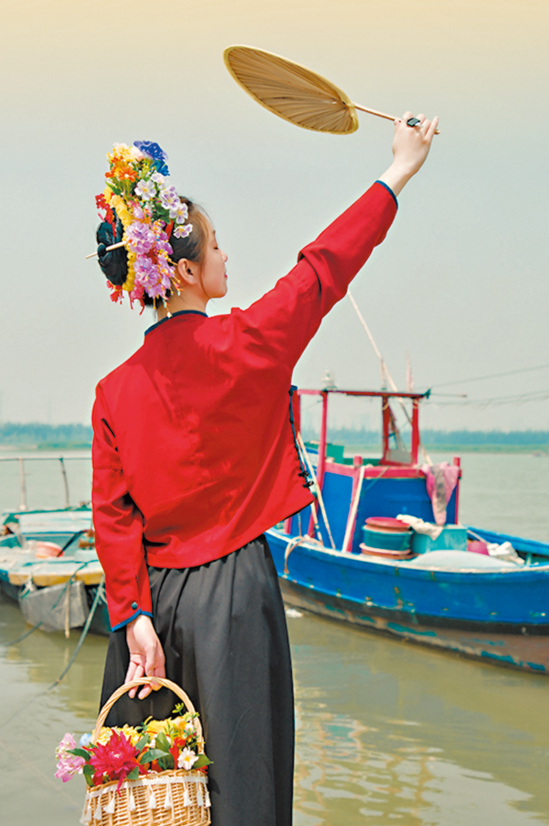 梳完頭、穿上紅艷艷的大裾衫,黃小姐便背上小魚簍在鏡子前左看右看,滿意地攜着同伴到海邊拍照去了。「海邊結束後就去拍蚵殼厝、撬蚵蠣。」