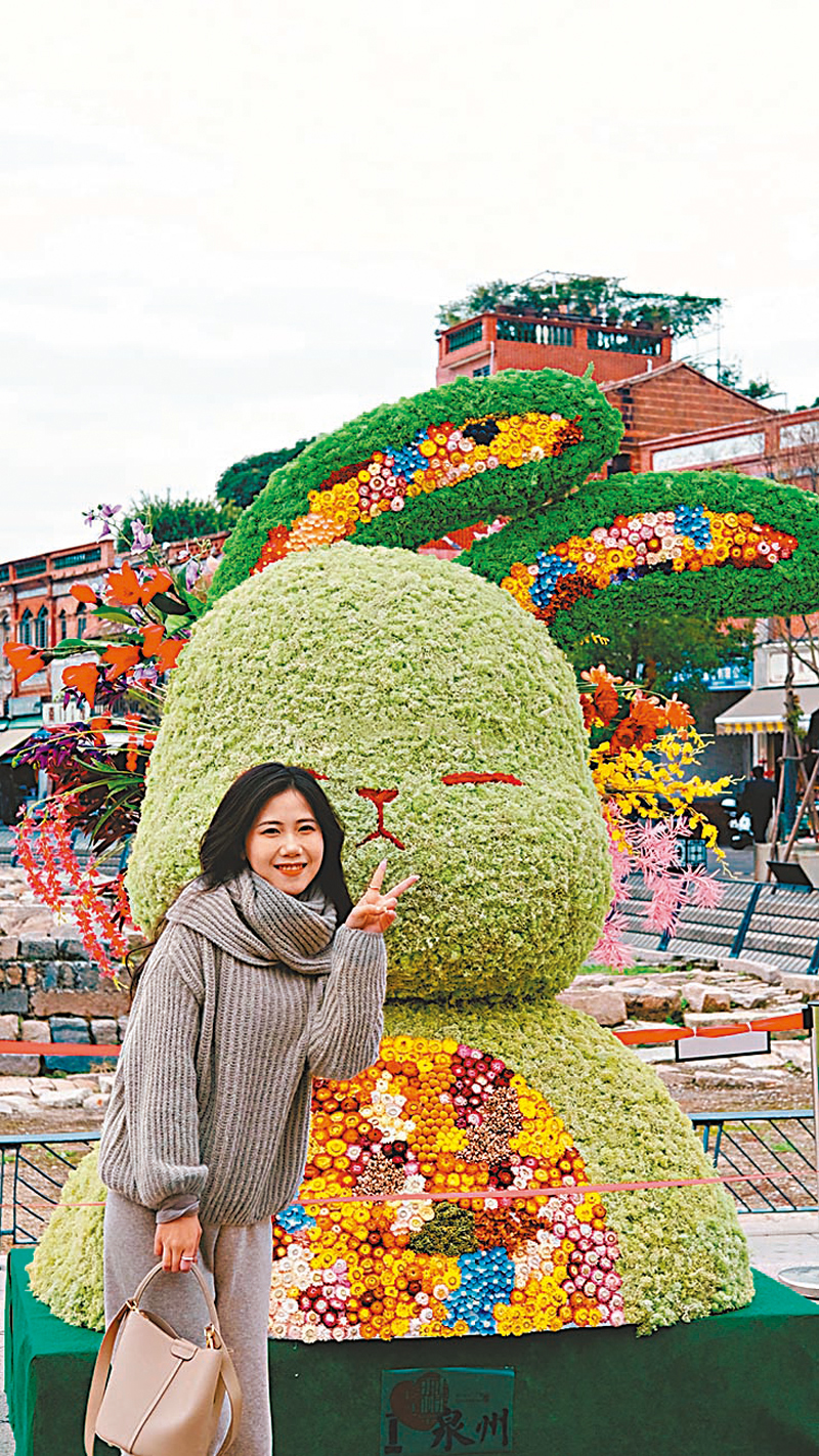 其實,在趙麗穎蟳埔女裝扮吸引廣大網友到蟳埔村打卡,梳同款頭飾前,泉州天后宮附近春節期間出現的「蟳埔簪花兔」,就更早在網絡平台「萌」出圈,幾乎成了全國兔年春節兔子藝術裝置的全網頂流。農曆兔年春節,全國各地紛紛上線兔子藝術裝置。泉州這隻憨態可掬的簪花兔,長2.5米,寬1.8米,高2.7米,頭戴國家級非遺簪花圍,採用鮮苔蘚、永生花、刺桐花等結合而成,淺綠色的主調,被親切地稱為「抹茶兔」。因蟳埔女與媽祖淵源深厚,簪花兔春節期間被安置在天后宮,蟳埔村媽祖巡香日當天則「移步」蟳埔村。