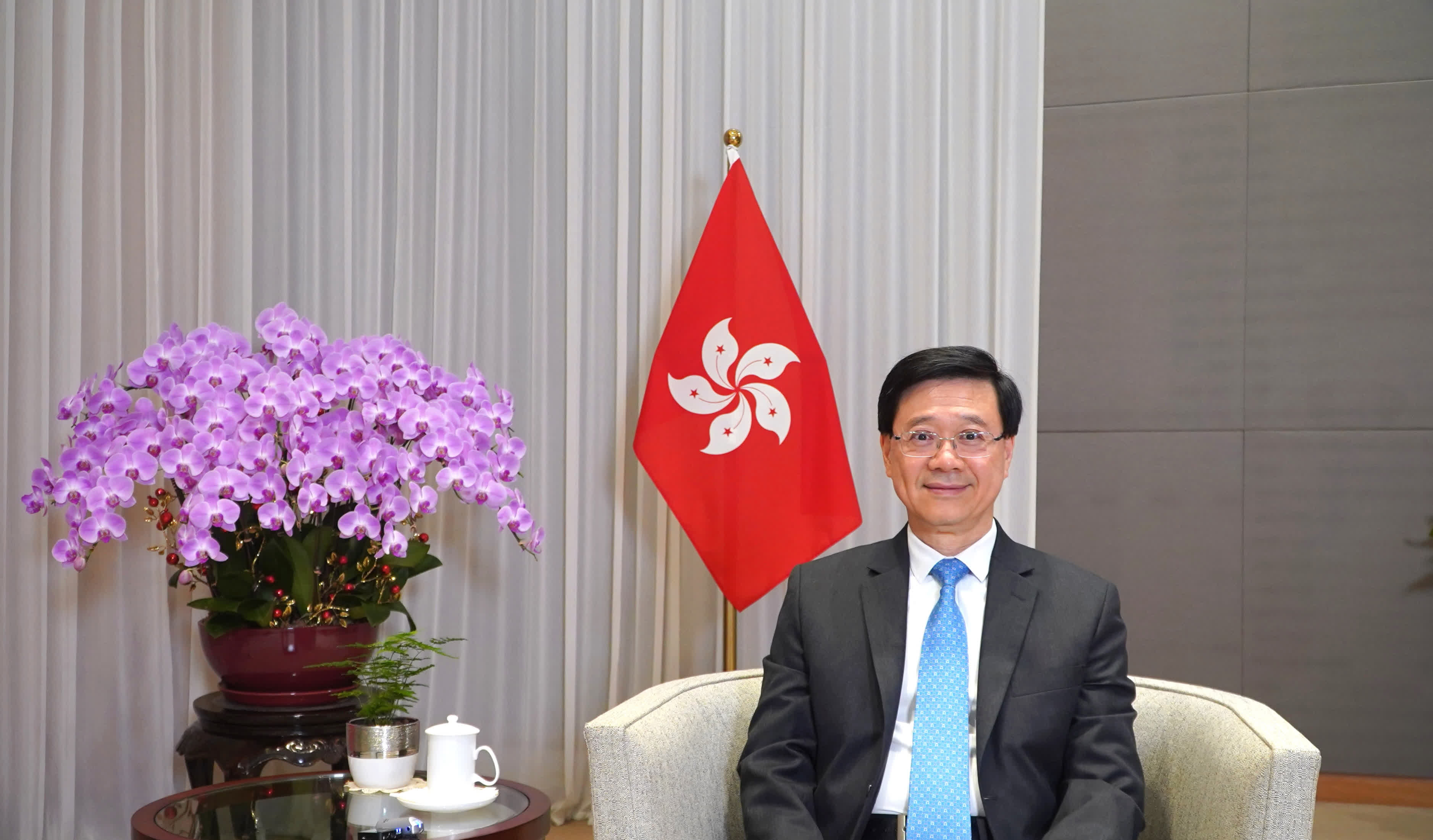於是大公報、香港文匯報和全媒體新聞中心的同事們連夜擬定採訪提綱,並在翌日提前在行政長官辦公室門口集合,在工作人員帶領下來到多次在新聞中出現的場景,房間的左右兩邊分別擺放中華人民共和國國旗和香港特別行政區區旗,中間依舊是一盆盛開的蘭花,而我留意到前面的小圓桌上擺放着一個清新淡雅的文竹盆栽。由於文竹四季常青,古人以「平身雖小且驚天,無節何嘗勁道綿。一寸短來強一寸,颶翁攪徹我依然」形容文竹,正正像是香港特區經歷2019年黑暴風波和三年新冠肺炎疫情後,雨過天晴、依然欣欣向榮。