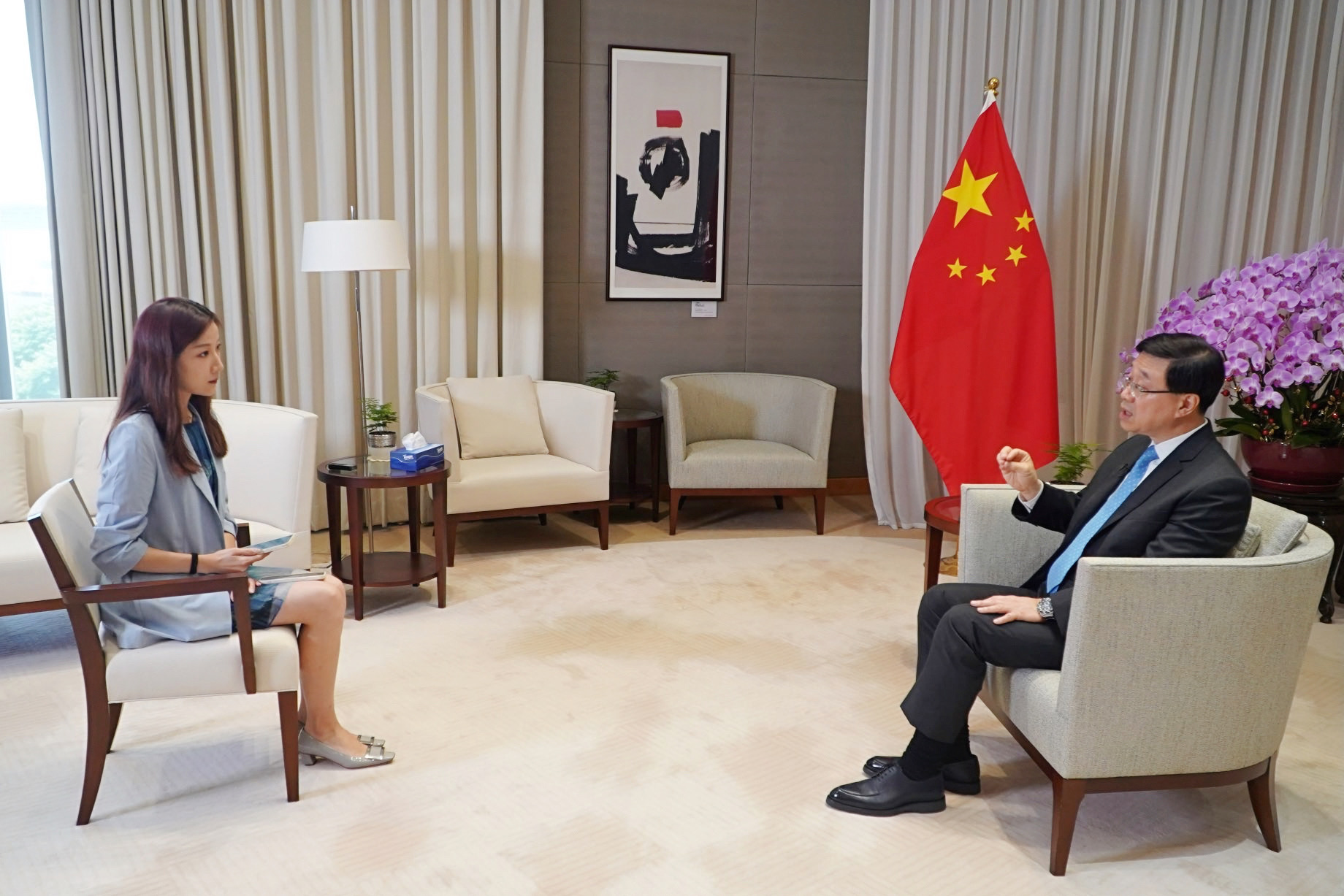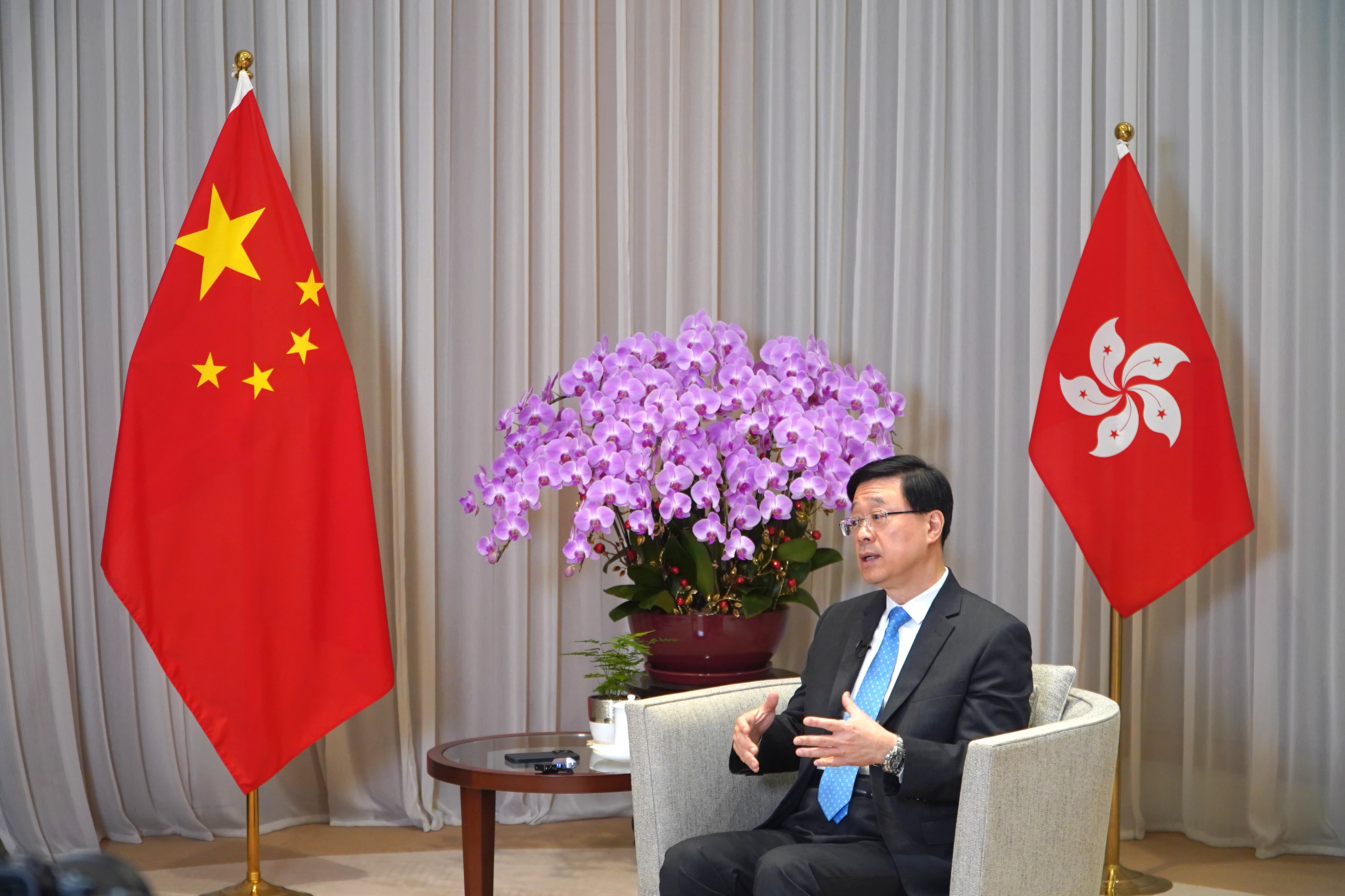 我們一邊調試設備,一邊聽政府新聞處的職員說特首行程安排非常緊密,今次訪問只能抽出一小時時間,便要離開。一切準備就緒後,特首來了!他從進門開始就微笑並與在場每位人士打招呼並說「辛苦你哋」,令大家感到特別溫暖。按照採訪提綱內容,我們分別圍繞制度設計、地區治理和回應質疑等多方面進行提問,期間特首會微笑着認真聆聽我們的問題,並從容地進行回答。談及「施政為民」「要讓市民受惠」時,他真切誠懇,但說到2019年攬炒分子騎劫區議會令其喪失諮詢和服務功能時,表情又轉為凝重嚴肅。自他上任以來,有他出席的記者會和各種活動我都報道了不少,也不時能有提問機會,但如此近距離地觀察到特首的神情,還是第一次。