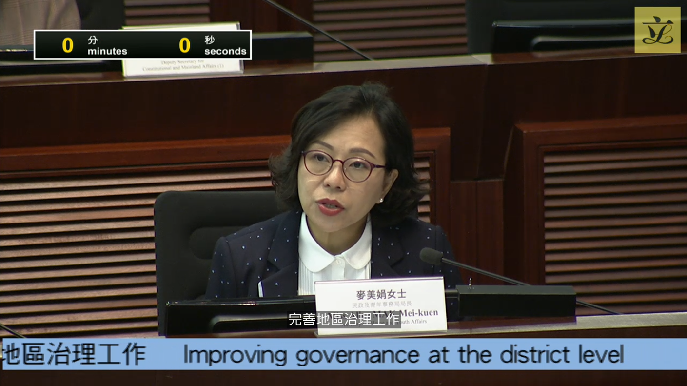 麥美娟回應指,雖然現時多個區議會仍由民選區議員擔任主席,事實上當區民政專員一直協助該區主席處理不少工作,因此工作量增加並非問題,重點應在於如何提高地區治理效能。改革方案中同時設立兩個高層次工作組,並由政務司司長及副司長領導,民青局團隊有信心發揮協同效應,做好地區工作。
