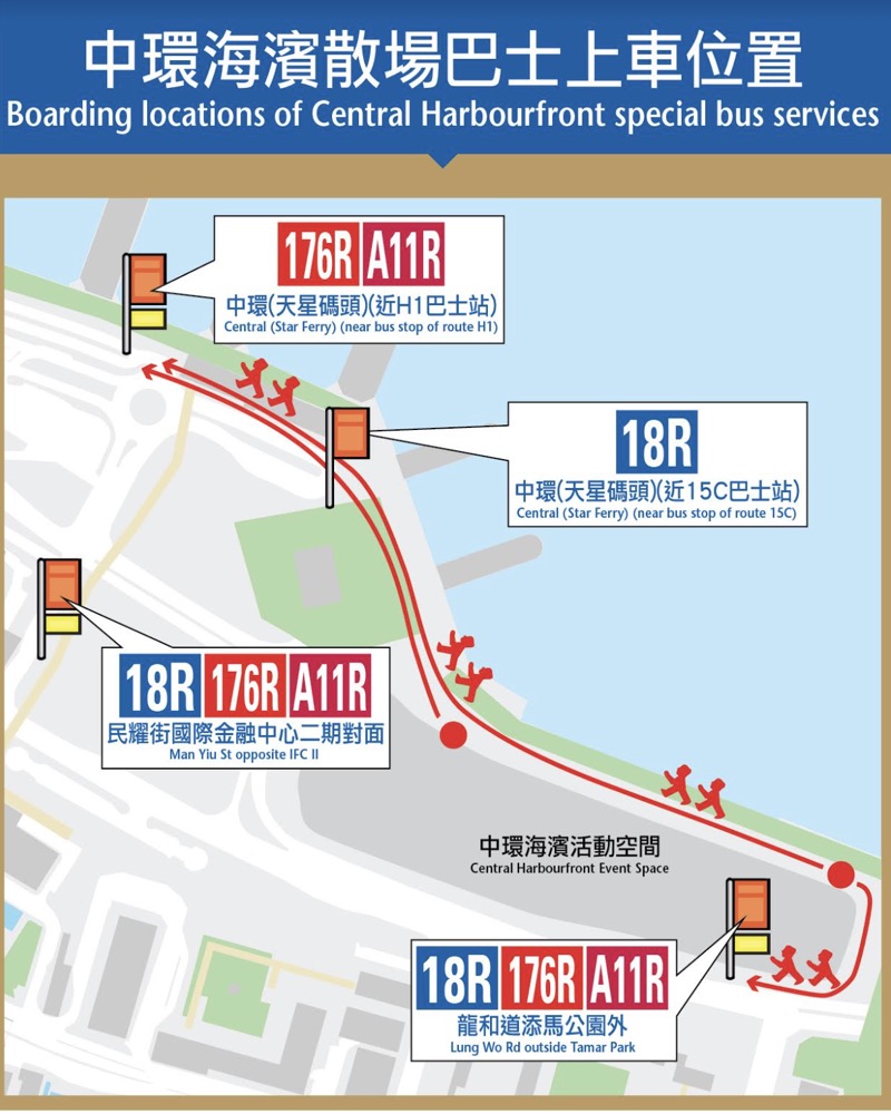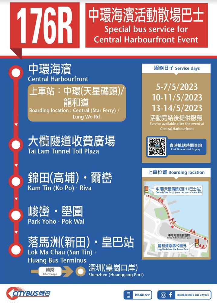 城巴新巴於5月5至7日、10至11日及13至14日特設3條特別路線,於活動完結後提供由中環前往各區的散場專車服務。新增的176R目的地為落馬洲新田皇巴站。粉絲可以乘搭「落馬洲-皇崗過境穿梭巴士」(簡稱「皇巴士」)前往深圳皇崗口岸。