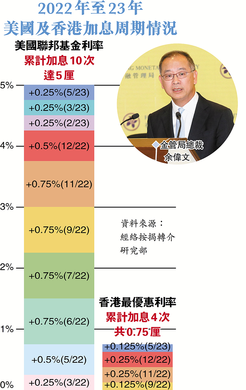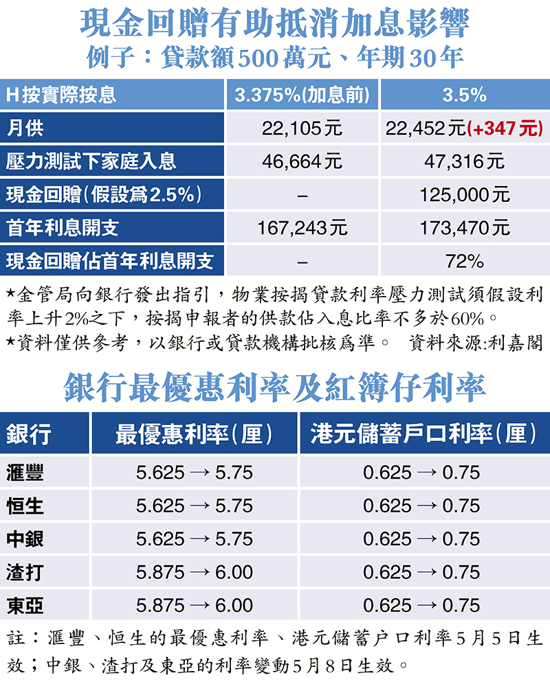 (香港文匯報 記者 曾業俊)美國聯儲局昨日一如巿場預期加息0.25厘,聯邦基金利率目標區間上調到5厘至5.25厘,為去年3月開展加息周期以來連續第10次加息,累加5厘。香港大型銀行亦跟隨加息,滙豐率先宣布今日起將最優惠利率(P)加0.125厘,至5.75厘,中銀、渣打、恒生及東亞亦跟隨加P,同樣上調0.125厘,是港銀今年首次提升。以借500萬元計,加息後每月供款多約347元,首年利息開支多約4,464元。業界對此建議,大型銀行近日上調按揭現金回贈至2.5%,置業人士可借助轉按慳息,借500萬元銀行現金回贈12.5萬元,可抵消加P影響。