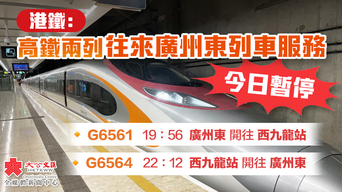 (大公文匯全媒體報道)港鐵今日(5日)凌晨表示,收到中國鐵路單位通知,個別高鐵列車今天暫停服務。受影響車次來往廣州東,分別是G6561和G6564。