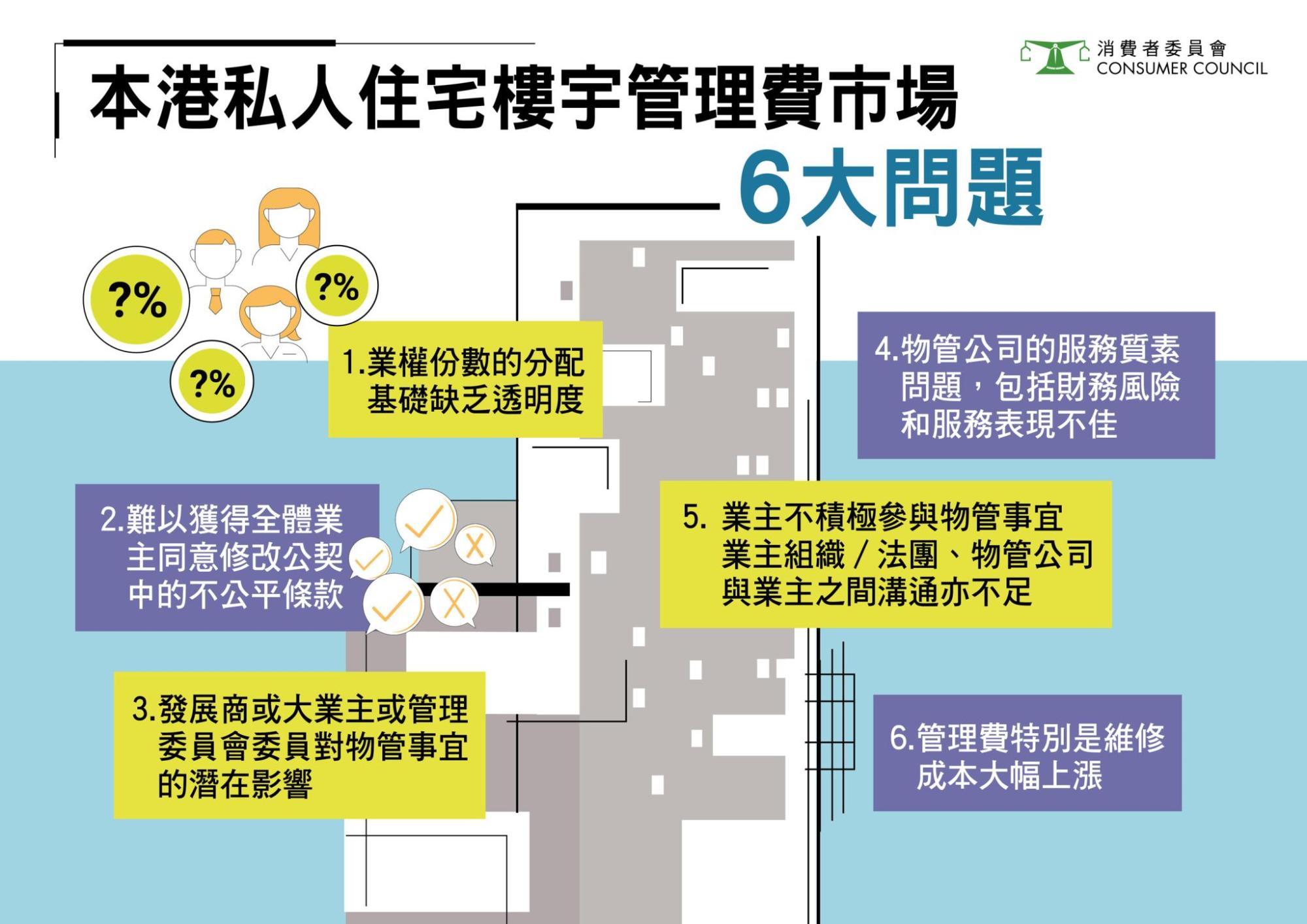 消委會調查發現本港現行的私樓管理制度有六大問題,包括業權份數的分配基礎缺乏透明度;難以獲得全體業主同意修改公契中的不公平條款;發展商或大業主或管理委員會委員對物業管理事宜的潛在影響;物管公司的服務質素問題,包括財務風險和服務表現不佳;業主不積極參與物業管理事宜,業主組織/法團、物管公司與業主之間溝通亦不足;業主缺乏物管知識及資訊,缺乏對樓宇未來維修保養需求的規劃,管理費尤其是維修成本大幅上漲。