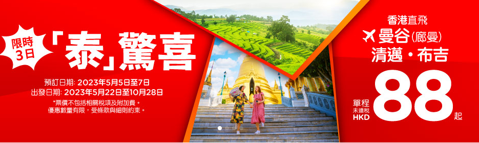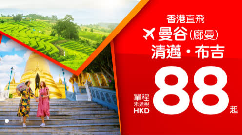 (大公文匯全媒體報道)亞洲航空(AirAsia)今日(5日)起推出限時3日機票優惠,香港飛泰國曼谷(廊曼)、清邁、布吉單程88元起,來回連稅曼谷/清邁905元、布吉995元起。