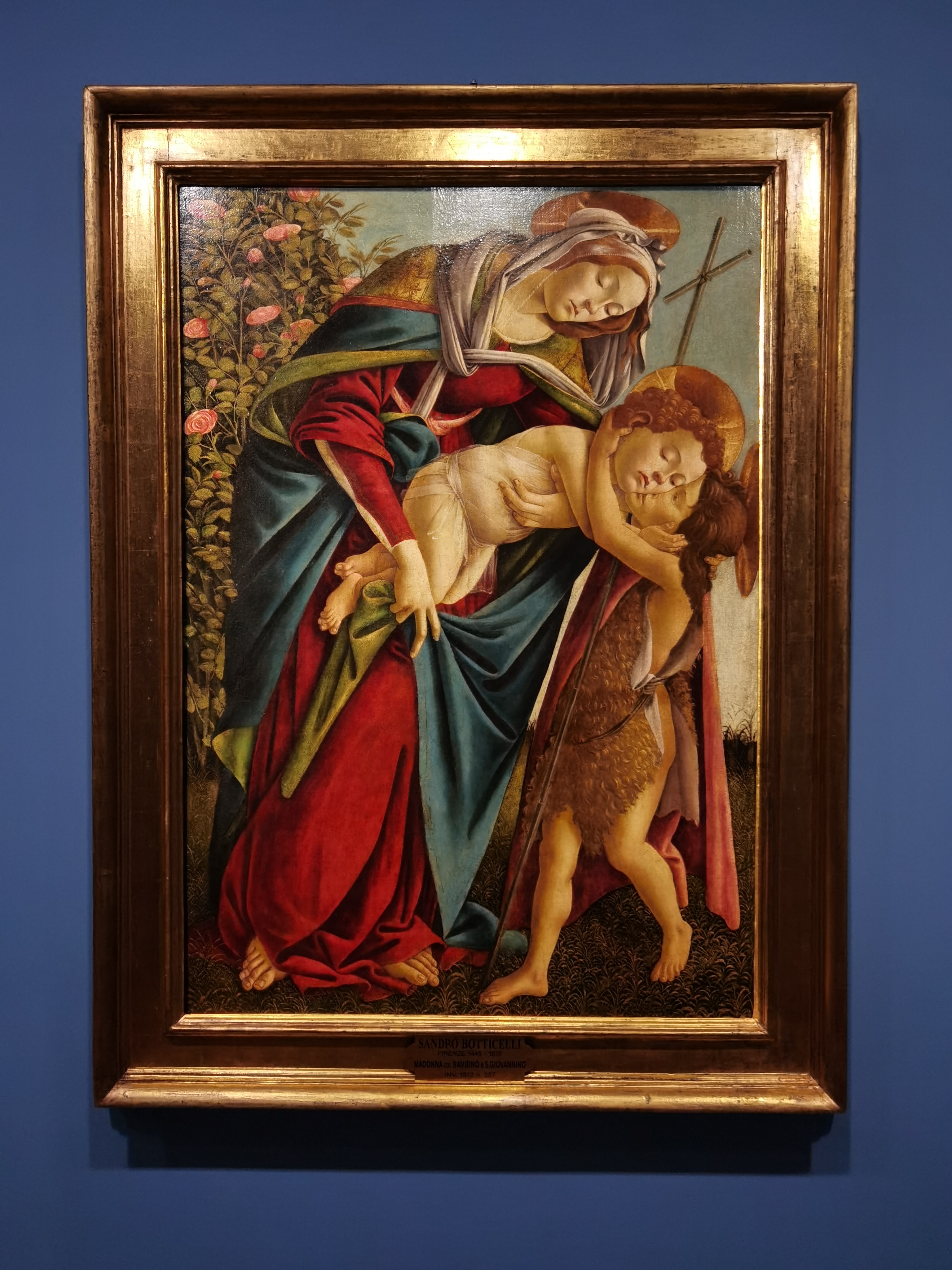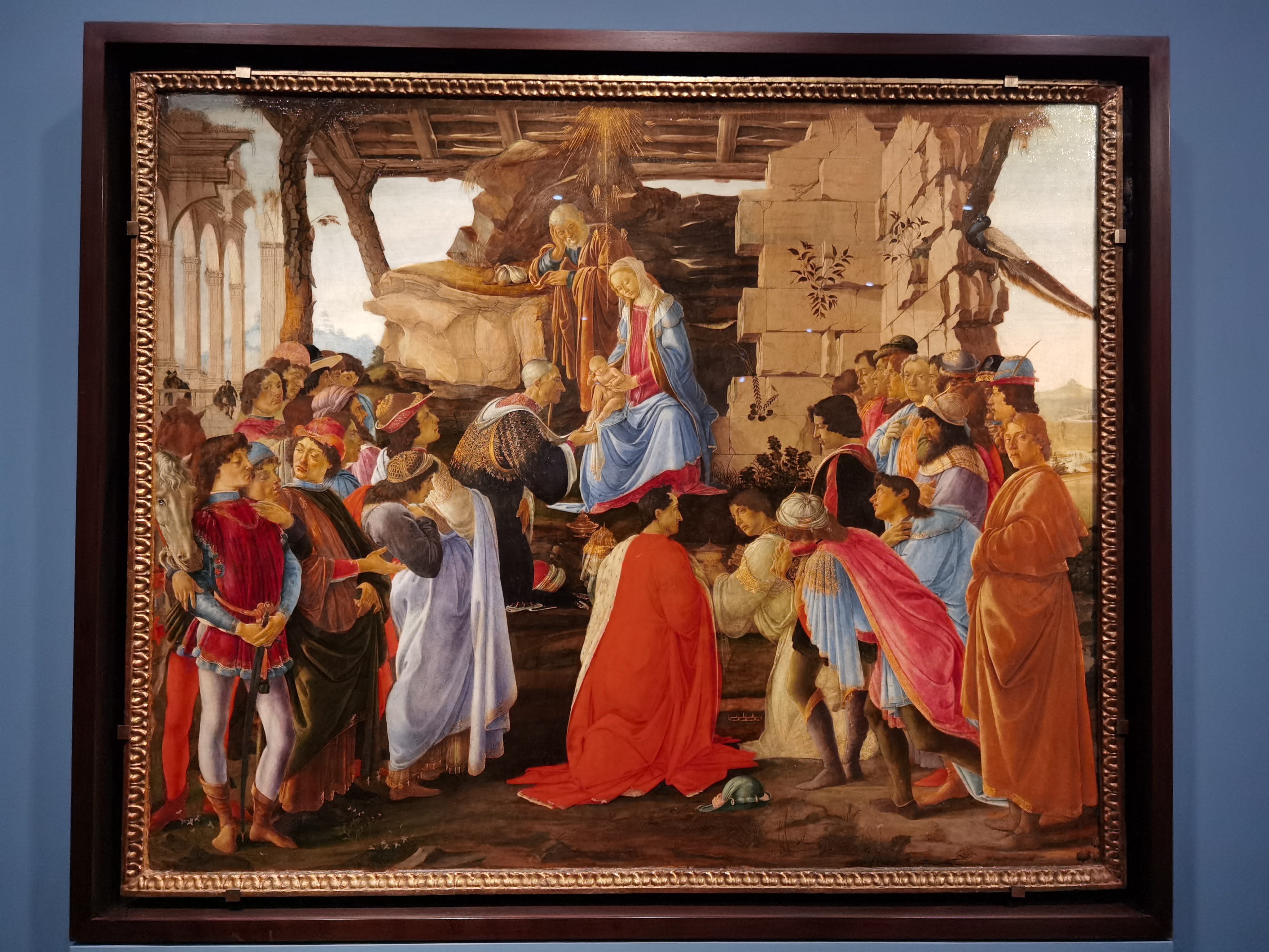 在展廳內,最引人關注的展品莫過於波提切利的《三博士朝聖》。這幅作品是波提切利創作的最好的宗教畫作之一。作品最為人津津樂道的,莫過於當時的不少真人被藝術家畫到作品裏面,其中包括了多位美第奇家族成員。在所描繪的眾多人物中,人們通常認為,在前景的右側,面對觀眾裹着淺棕色鬥篷的年輕人是畫家波提切利。當時他大約30歲,他的自畫像與許多知名人物一起出現,證明了美第奇家族及其盟友對他作品的喜愛。