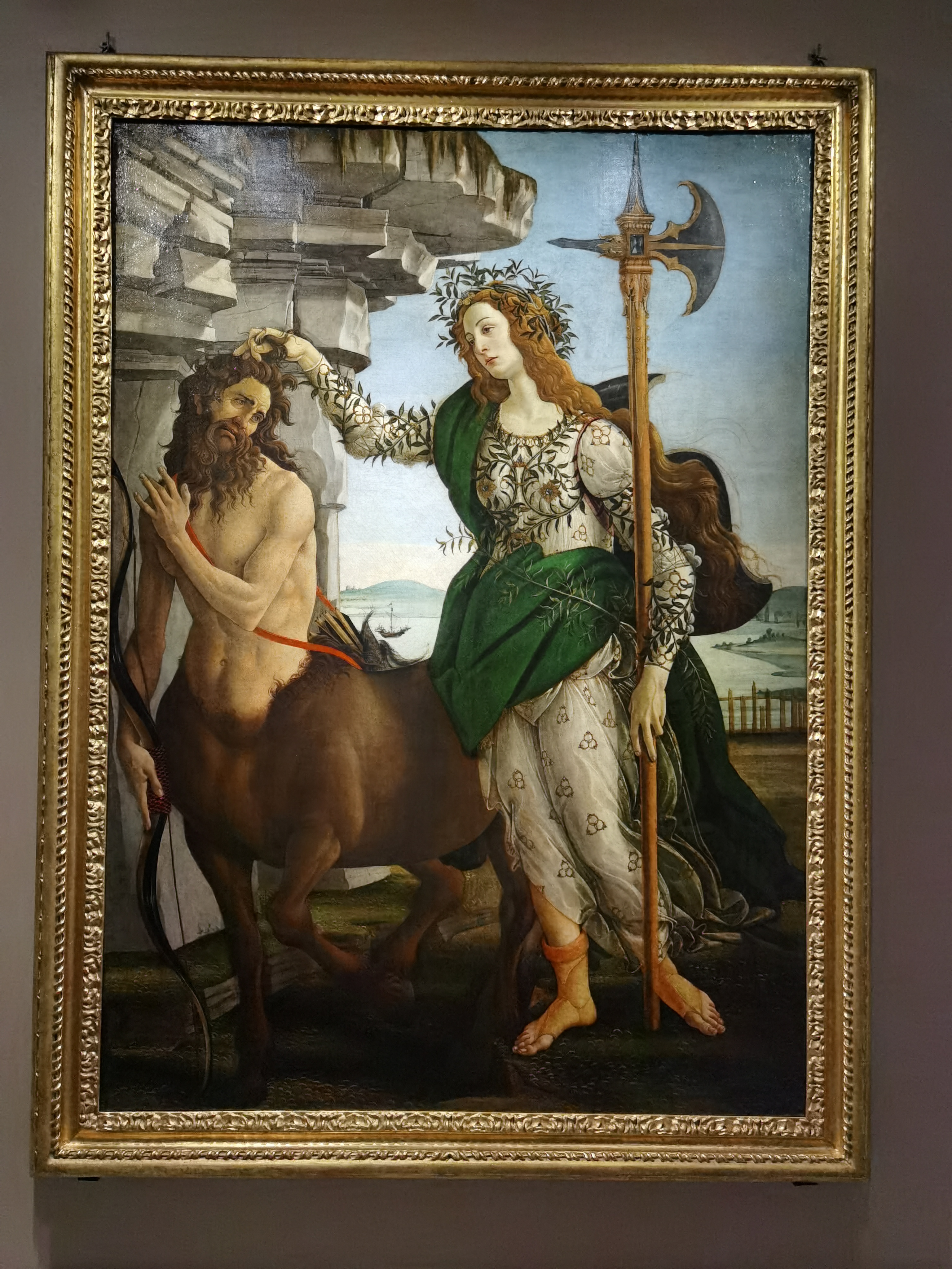 首次來到中國的《女神帕拉斯·雅典娜與半人馬》,很多人對其主題及含義理解仍有爭議。畫作描繪了一位年輕迷人的女性,她背着盾牌,手持長戟,抓着半人馬的頭髮;半人馬則擁有馬的身體和人類的軀幹,是希臘和羅馬神話中的生物。半人馬的面部表情似乎與女性形象的寧靜形成對比,他手持的弓是傳統的狩獵武器,肩上背着裝有箭的箭筒。女士身穿的白色長袍上反覆裝飾着由三個鑽石戒指組成的紋章標誌。在遠處,我們可以看到由海景構成的背景。這件作品記錄了波提切利將古代世界的題材和主題帶入現實生活並加以更新的能力。他使用源自古典雕塑的模型,通過非凡的手繪能力將其轉化為繪畫。這些人物,即使是粗獷的半人馬,也因身體的蜿蜒形狀而呈現出一種優雅的氣質,畫面右側照射的黃昏或黎明的光線使其表情變得慵懶。研究表明,這幅畫極有可能是波提切利在1482年從羅馬回來後創作的。