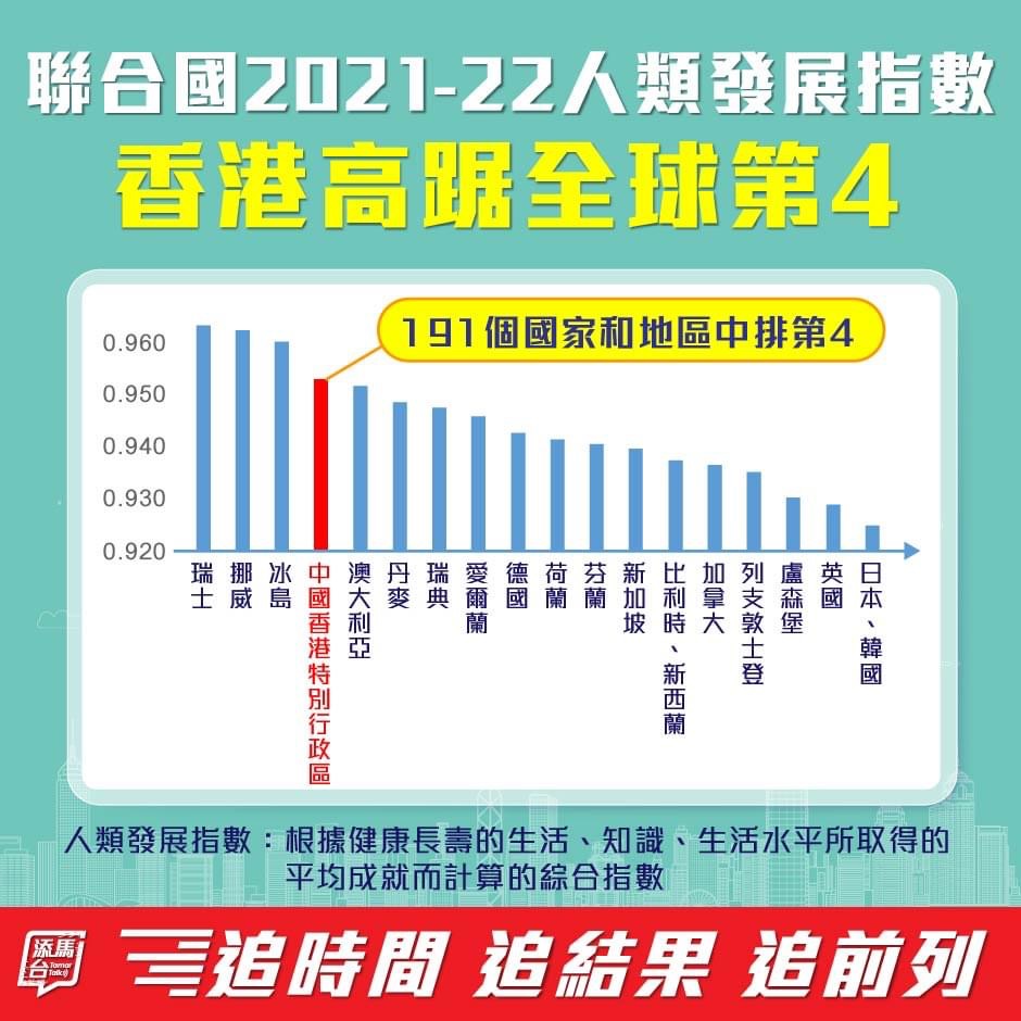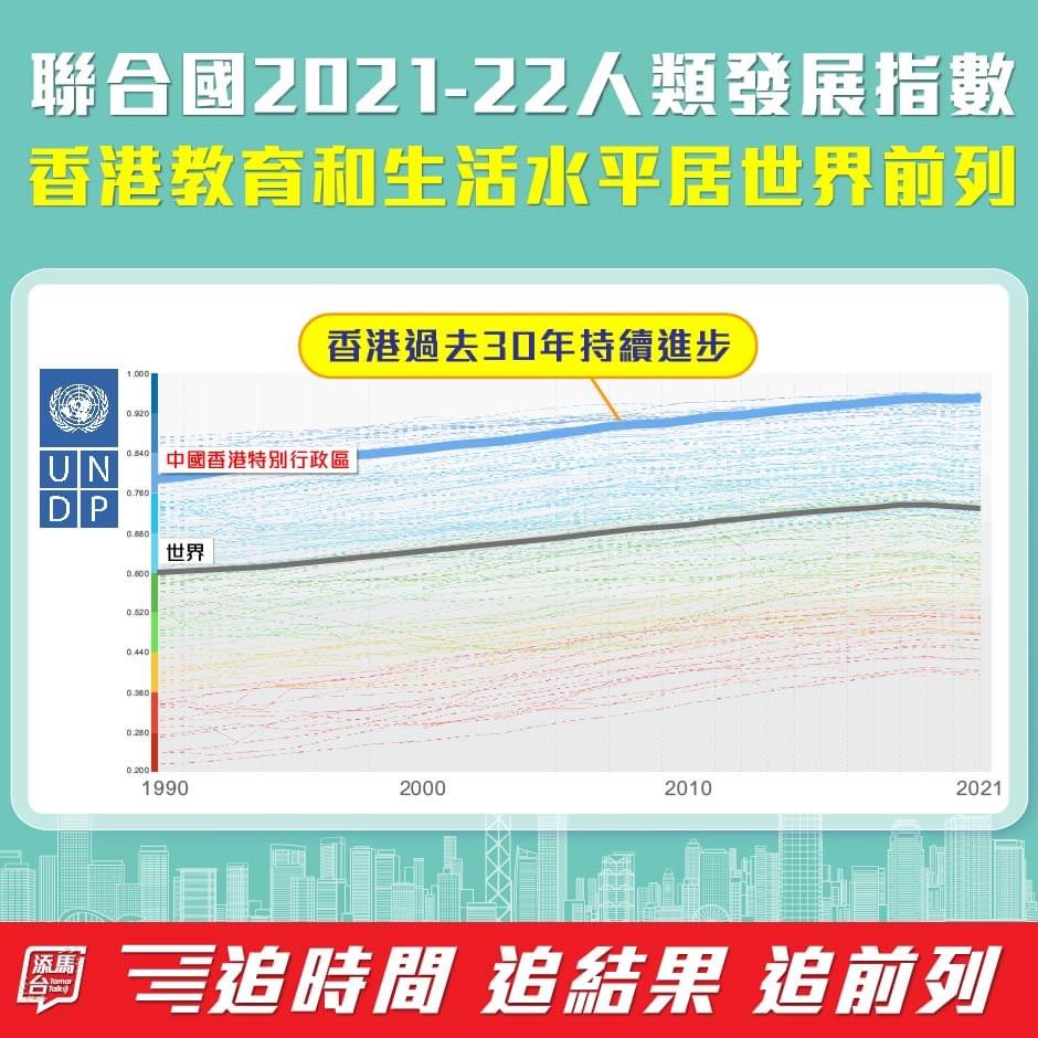 大公文匯全媒體報道,特區政府今日(5日)表示,聯合國開發計劃署公布的《人類發展指數》調查報告顯示,2021年至22年香港在191個國家和地區中排名第4,意味着香港的教育和生活水平均位居世界前列。數據顯示,香港在過去30年間持續進步。