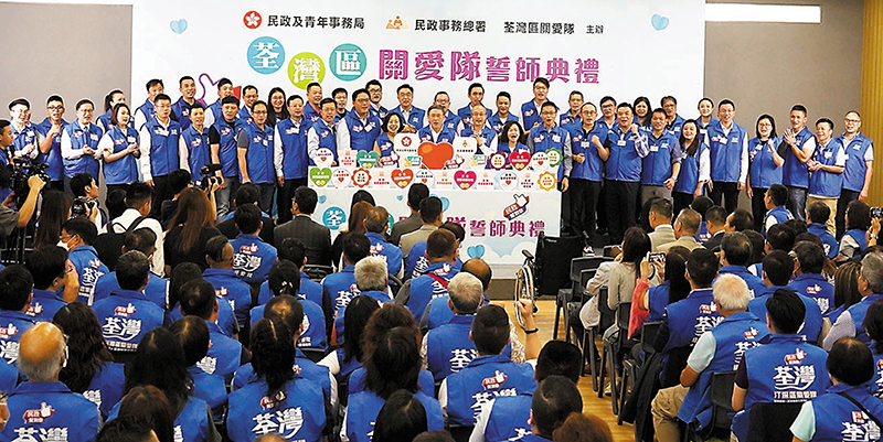 香港特區政府政務司副司長卓永興,和民政及青年事務局局長麥美娟主持了誓師典禮。荃灣區十九小區的「關愛隊」在荃灣民政事務專員區家盛和19位小隊隊長帶領下,將為當區居民提供多元化的關愛服務。