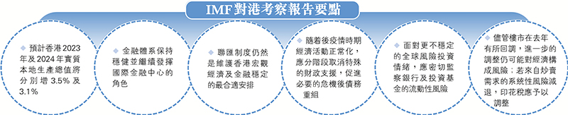 IMF的代表團每年都會與其成員,就IMF協定第四條開展磋商,在完成與香港特區政府討論後,昨日就其評核發布初步總結。代表團讚揚特區政府在推動經濟增長和維持金融穩定的工作。代表團認為,香港金融體系穩健,即使在充滿挑戰的全球宏觀金融環境下,仍繼續充分發揮國際金融中心角色。穩健的金融體系建基於香港穩健的制度框架,特別是對金融業的規管水平甚高,又具有充裕的資本和流動性緩衝,以及運作良好的聯匯制度。隨着經濟活動復常,香港經濟展現強勁復甦。