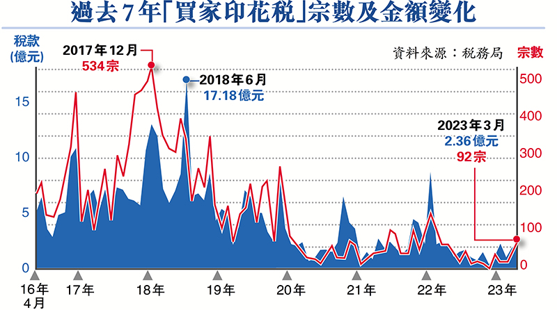 IMF指,若樓市炒風減退則政府可考慮「減辣」,防止在利率上升、樓市下跌對經濟構成風險。那麼現時本港樓市的炒風情況如何?從反映樓市炒賣情況的買家印花稅(BSD)統計來看,BSD涉及稅款已由2018年高位的17億元,反覆跌至2023年3月的2.36億元,涉及稅款累積跌幅高達86%;BSD宗數則由2017年12月的534宗高位,減至今年3月的92宗,減幅83%。