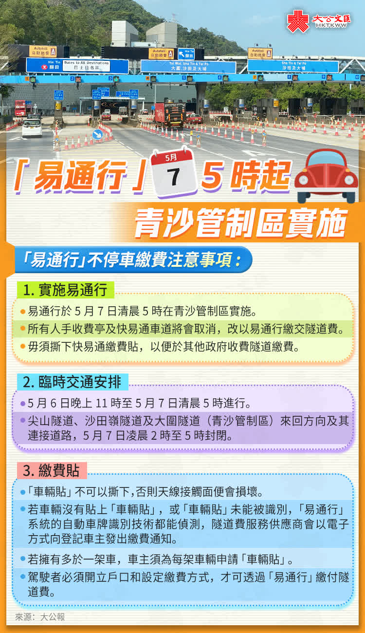 大公文匯網報道,「易通行」將於明日清晨五時起,在青沙管制區實施,為配合實施「易通行」,青沙管制區一帶在今天晚上11時起分階段實施臨時交通安排。運輸署署長羅淑佩昨日表示,「易通行」的籌備工作大致完成,現時已經發出68萬個車輛貼,約佔全港85%車輛,當中逾七成已開立戶口及綁定自動繳費模式,她提醒未完成程序司機盡快辦理車輛貼申請。