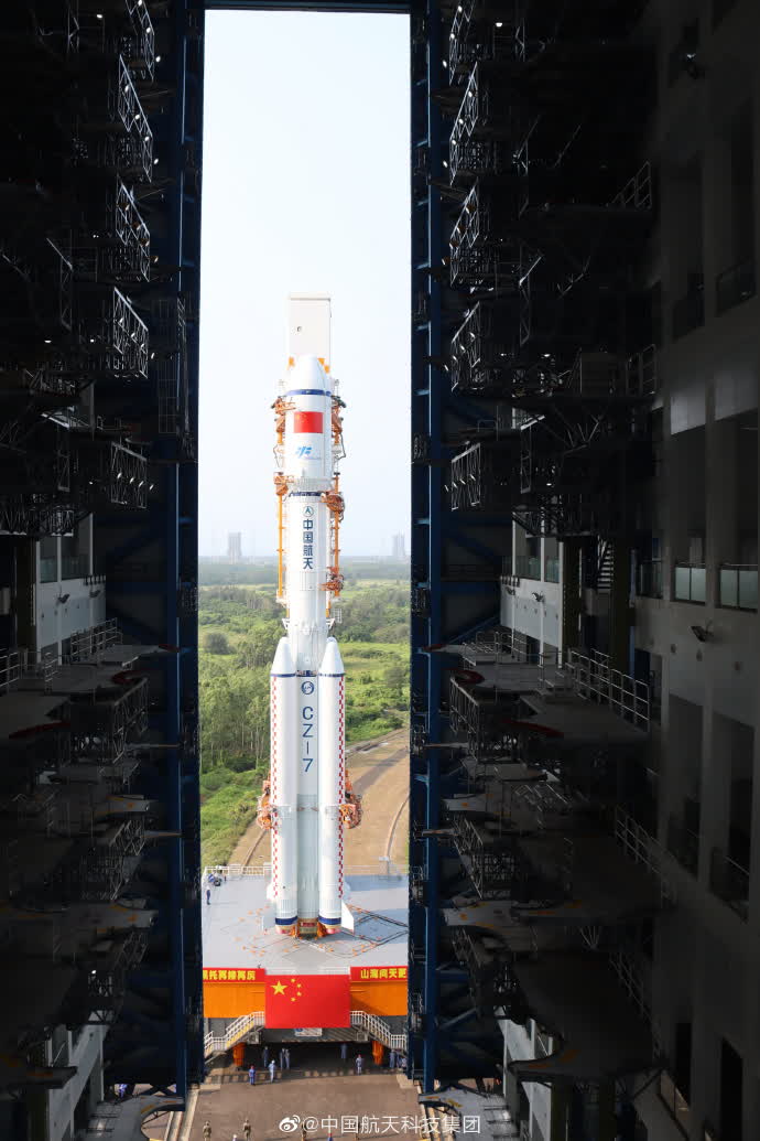 據中國載人航天工程辦公室消息,北京時間2023年5月7日,天舟六號貨運飛船與長征七號遙七運載火箭組合體垂直轉運至發射區。