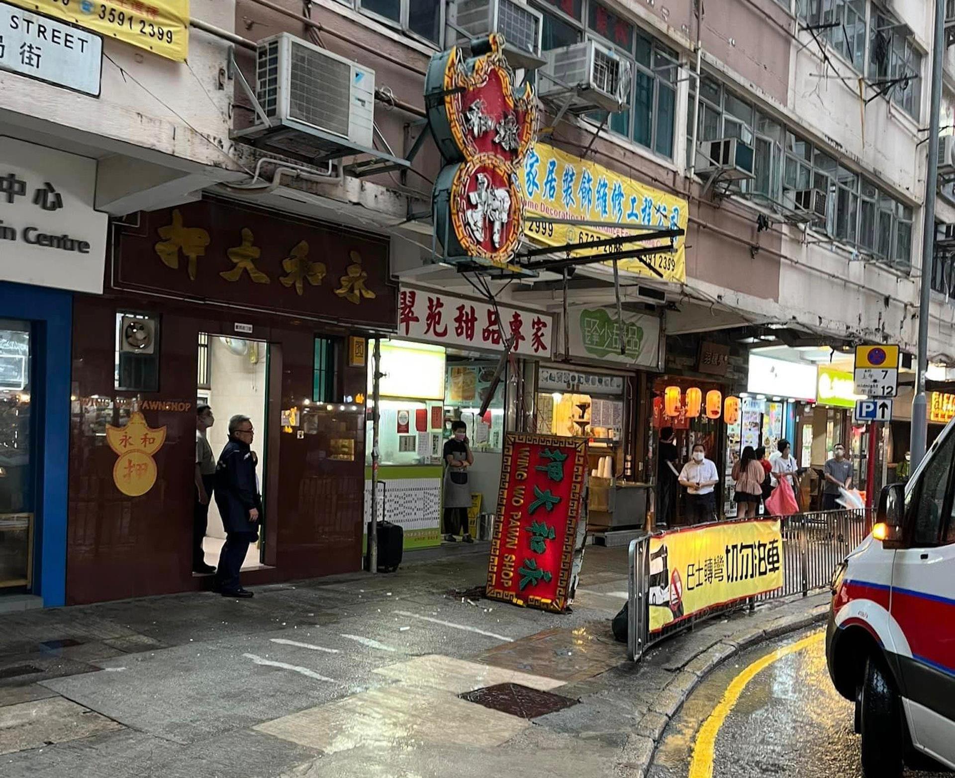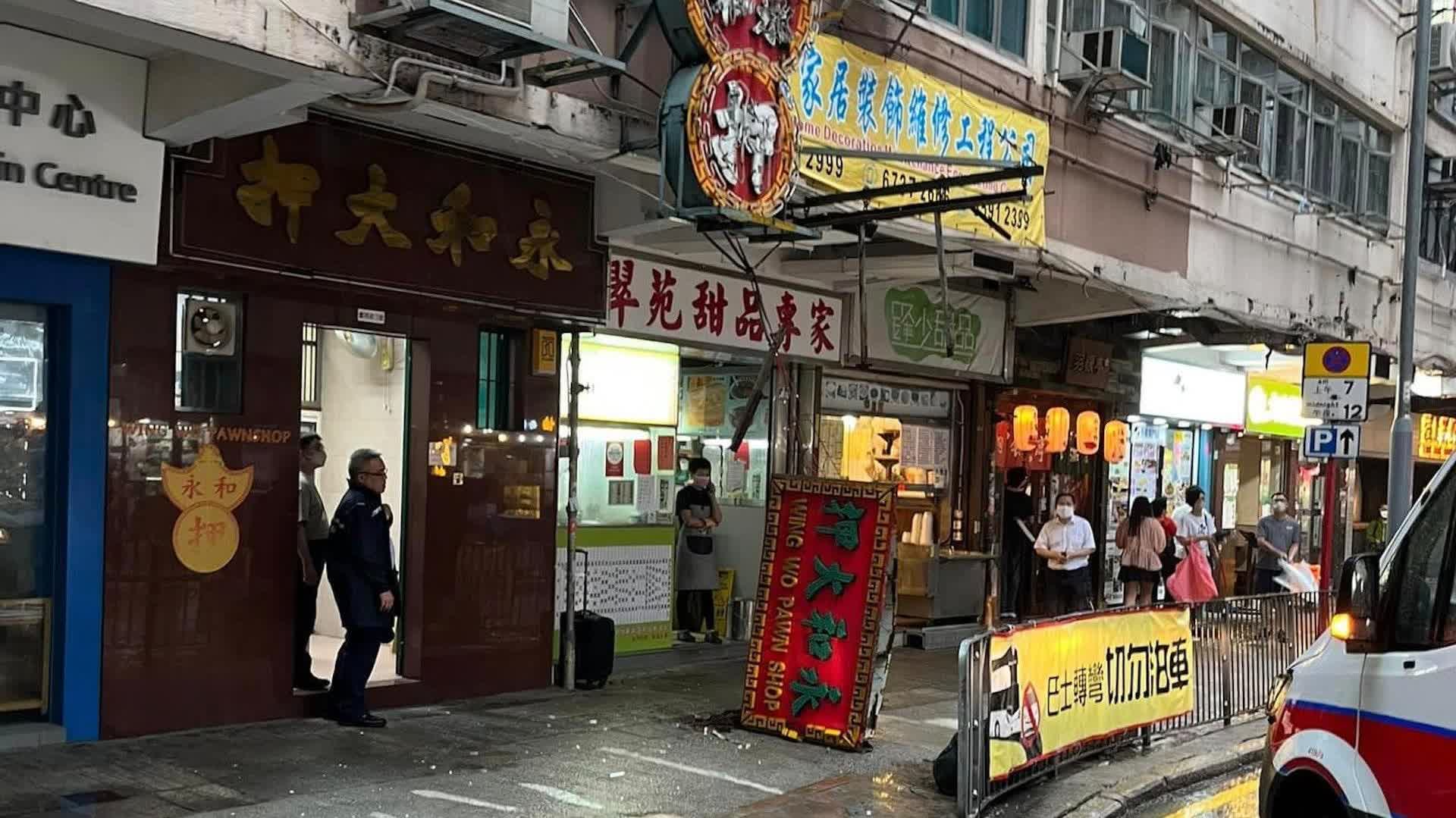 警方派員到場,發現一個1.5乘0.5米的招牌跌下,列作「高空墮物」處理,幸沒有途人受傷。