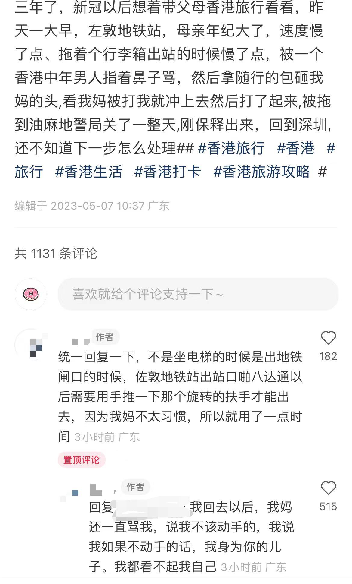 有關帖文引發網民熱議,事主回應網民指,事發於出地鐵閘門時,因佐敦站的閘機是舊式閘機,乘客拍八達通卡後需要用手推旋轉扶手才能出去。事主指,母親年齡大、拖有行李箱,及不太習慣舊式閘機,所以用了一點時間,未料被一名中年男人指着鼻子罵,對方更「拿隨行的包砸我媽的頭,看我媽被打我就衝上去然後打了起來」。事主補充指,後來被拘留在油麻地警署,至今早被保釋,目前已返回深圳,「我回去以後,我媽還一直罵我,說我不該動手的,我說我如果不動手的話,我身為你的兒子。我都看不起我自己」。