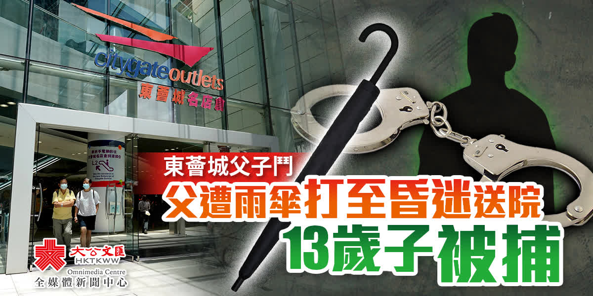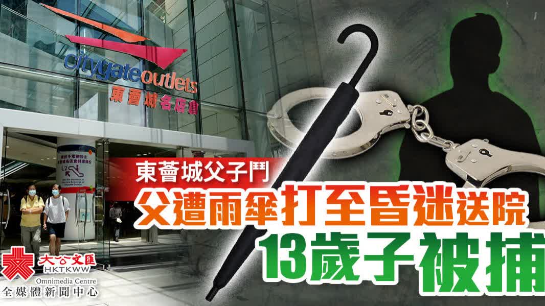 大公文匯全媒體報道,今日(7日)晚約7時,警方接獲報案指,一對父子在東薈城4樓一間服飾店外因事大打出手,40多歲父親被雨傘打至頭部受傷、手部擦傷,昏迷由救護車送北大嶼山醫院救治。涉案13歲兒子涉嫌襲擊致造成實際身體傷害被捕。