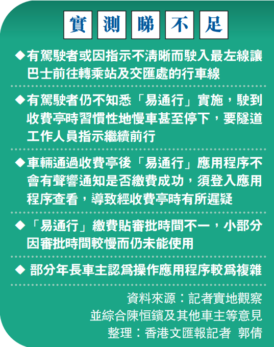 陳恒鑌則對香港文匯報表示,經過收費亭時,車窗上的繳費車輛貼不會提醒已扣費,要登入應用程序查看是否扣費成功,「日本現在亦實施這些自動繳費,司機要在車內安裝一個小盒子,但這個小盒子有『滴』一聲的提示音告知司機成功繳費。」由於不能即時知道是否成功繳費,可能會令駕駛者駛經收費亭時有所猶豫。他提醒駕駛者經收費亭時切勿停下,因易導致交通混亂,「就算應用程序顯示繳費失敗,14天內補交都是可以的。」