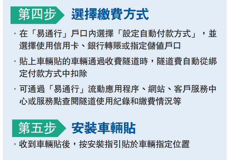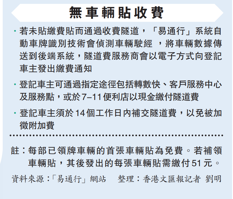 至於未有車輛貼使用「易通行」繳費的車輛,會被追繳隧道費,「會影車頭車尾的車牌,及有其他方法可以搵架車出來,首先會通知駕駛者需要補交隧道費,若7個工作天後未補交,會有另一個通知,即有兩次提醒,到14天仍未交則有175元的附加費,若多次催繳仍然不交,過了另外21天,則會有350元附加費,再之後也不交則會採取法律行動去控告車主。」
