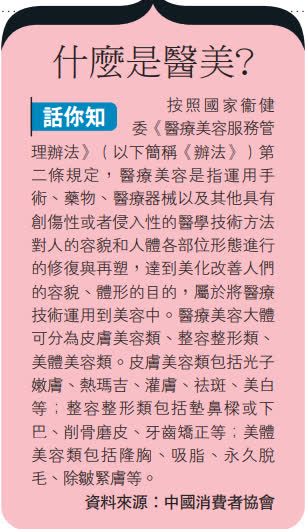 (大公報記者 盧冶、林凱)「9.9元祛痘」、「免費體驗微整療程」……為了變美,人可以在「醫美」的道路上走多遠?醫美,即醫學美容,是通過醫學手段(藥物、儀器及手術等)以增強人體外在美感的一系列治療。但在內地,醫美手術失敗導致毀容甚至身亡、以醫美為名義的網貸騙案等慘劇近年來屢見不鮮,機構非法行醫、虛假宣傳等情況屢禁不止。近日,市場監管總局、公安部、商務部、國家衞生健康委等十一部門聯合印發《關於進一步加強醫療美容行業監管工作的指導意見》(下稱《指導意見》),指出要掃清「黑機構」「黑醫生」「黑藥械」,劍指醫美亂象。