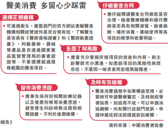 市場監管總局4月也制訂發布了《醫療美容消費服務合同(示範文本)》,着重強調了對消費者進行保護。吉林廣律律師事務所實習律師王祉鎣表示,「一是增強信息透明。經營者對消費者明示美容醫療機構資質、醫師執業資格、相關藥械等相關信息的查證溯源渠道,引導消費者接受正規醫療美容服務。二是倡導理性消費。示範文本督促機構應當規範營銷行為,不得在宣傳中製造『容貌焦慮』。三是設置『冷靜期』條款。基於醫療美容服務的特點,示範文本特別設置了單方解除權條款,賦予消費者在冷靜期內無責任解除合同並要求全額退款的權利,保護消費者『後悔權』。」