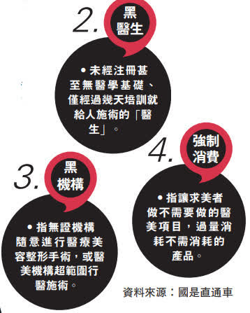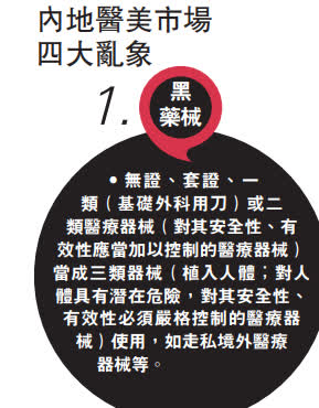 此外,醫美黑作坊使用的設備也同正規機構有着天壤之別。「我們醫院的設備動輒幾十萬元(人民幣,下同),多是從國外引入;到了黑機構那裏,就變成以價值兩三萬元的高仿設備冒充正品。」這位工作人員續指,醫院周圍黑機構多打價格戰來擠壓正常市場,很多機構資質都不齊全。黑作坊之外,還有一類在賓館作業的游醫。「他們會定期在賓館租一個房間,隨身帶着針和設備,租個三五天就走。出任何事根本都找不着人,即使這樣,還是會有許多消費者對此趨之若鶩。」小貝表示。