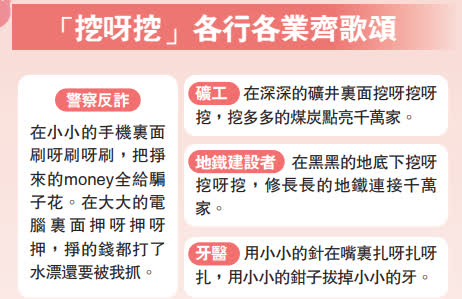 「在高高的天山下挖呀挖呀挖,挖長長的隧道便利千萬家」、「在碧海藍天的碼頭裏挖呀挖呀挖,種科技的種子開智慧化的花」……琅琅上口的旋律中,各行各業的創作者將自己的奮鬥故事融進歌詞裏,向網友們展現了「千行百業齊開花」的場景,也引發了人們為祖國的建設者點讚。