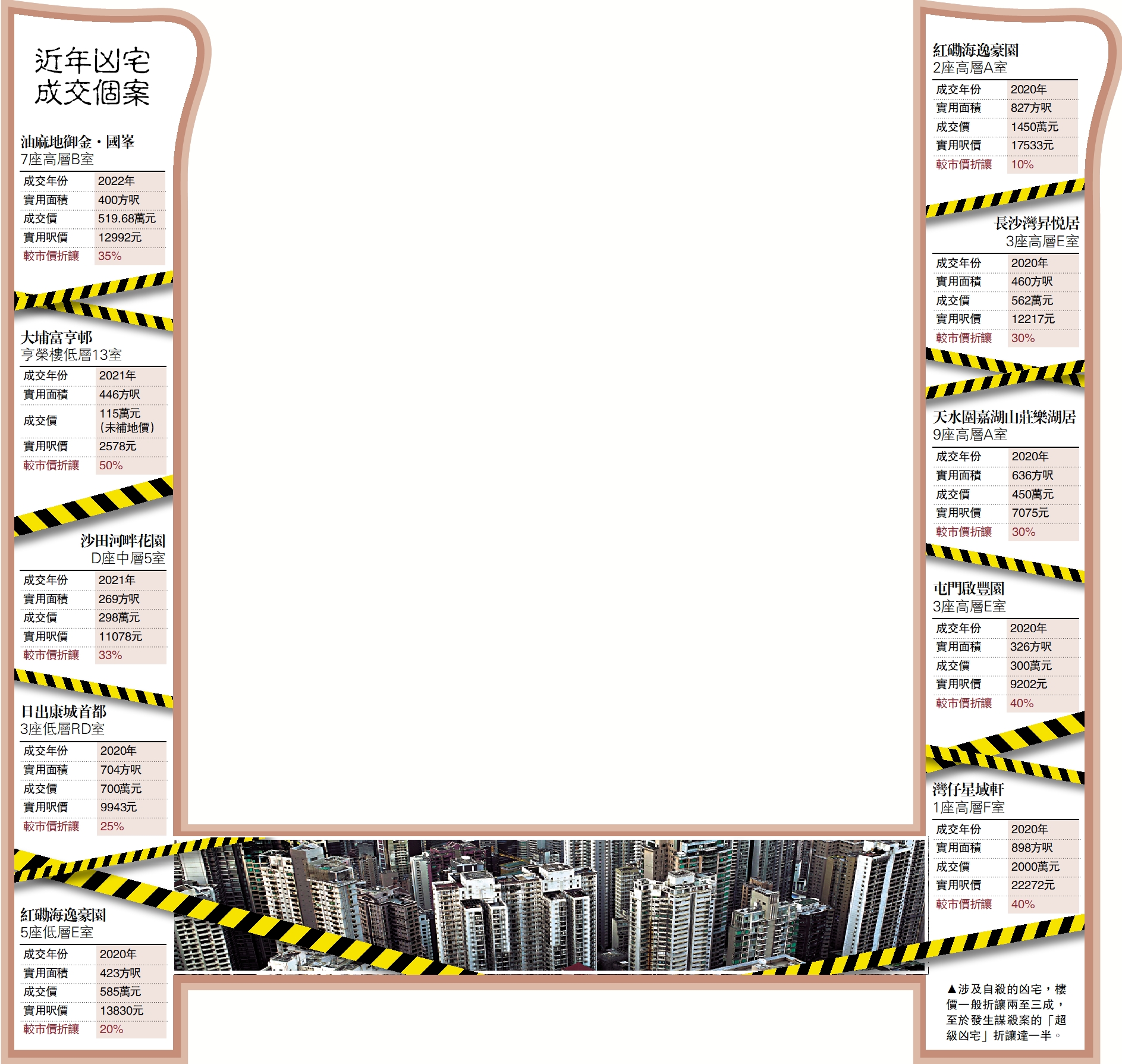 凶宅同層、樓上或樓下單位,普遍比市價有一定折讓,經常吸引膽大買家執平貨。不過,業界人士提醒,買凶宅鄰近物業未必可以獲批正常按揭,若事故單位曾發生轟動案件,「極凶」命案將牽連周邊單位估值,買家隨時要一筆過付款入市。