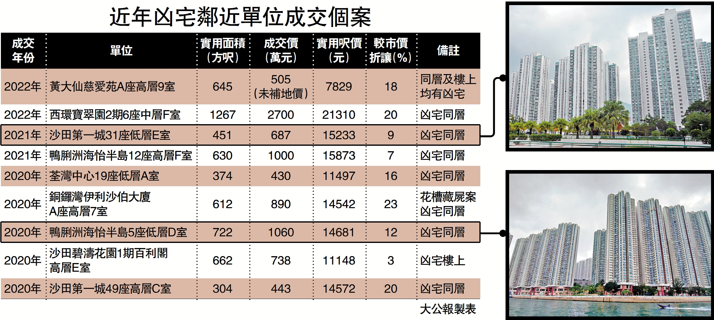 地產代理指出,該單位6年前發生夫婦雙屍命案,一對公務員夫婦發生爭執,丈夫以刀刺傷妻子後,將其拋出屋外後,自己再跳樓,兩人分別伏屍於兩個地面單位的平台花園內,涉事三個單位均淪為凶宅。