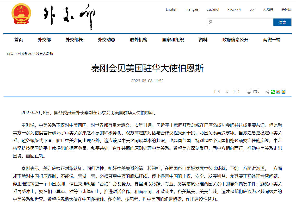 據外交部網站消息,今日(5月8日),國務委員兼外長秦剛在北京會見美國駐華大使伯恩斯。