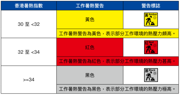 - 紅色工作暑熱警告,表示部分工作環境的熱壓力甚高;