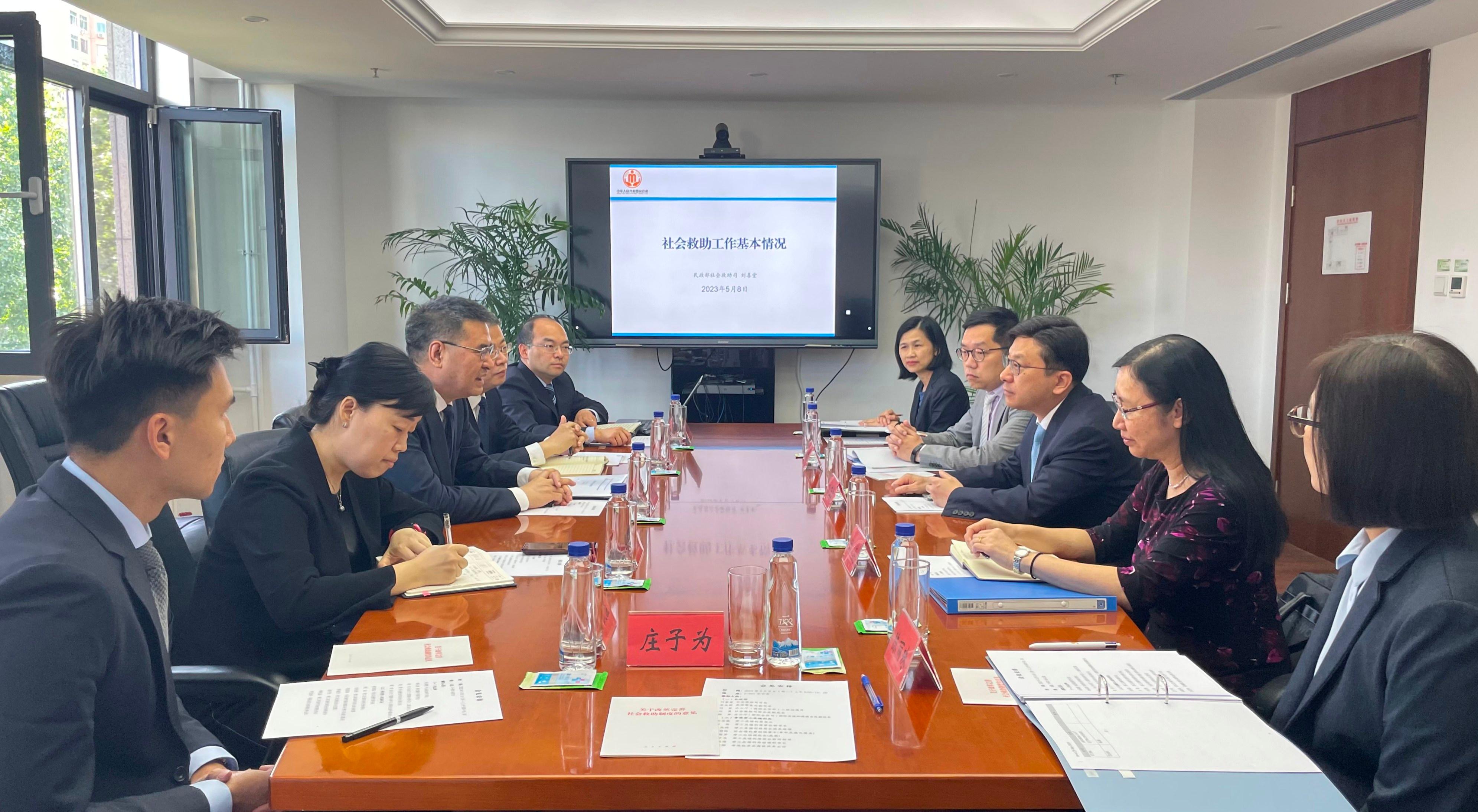 孫玉菡上午在勞工及福利局常任秘書長劉焱陪同下,先拜會民政部社會救助司司長劉喜堂及養老服務司副司長李永新,就社會救助政策及長者社區和院舍照顧服務等交換意見,並探討融入國家發展大局的方向,特別是粵港澳大灣區城市之間的合作。孫玉菡表示,正跟進安老及康復服務可協作的範疇,以應對人口高齡化的挑戰。特區政府亦會參考內地過往精準扶貧的經驗,制訂精準扶貧項目。