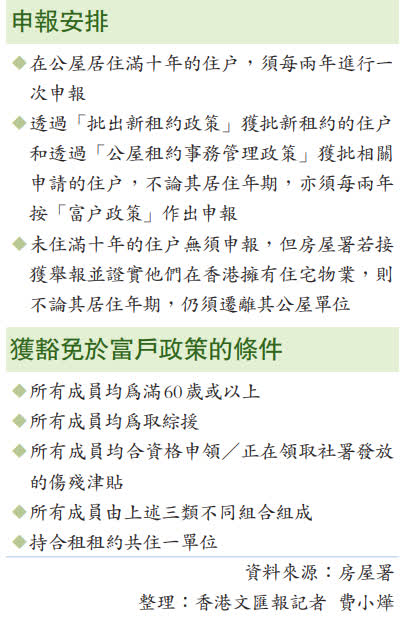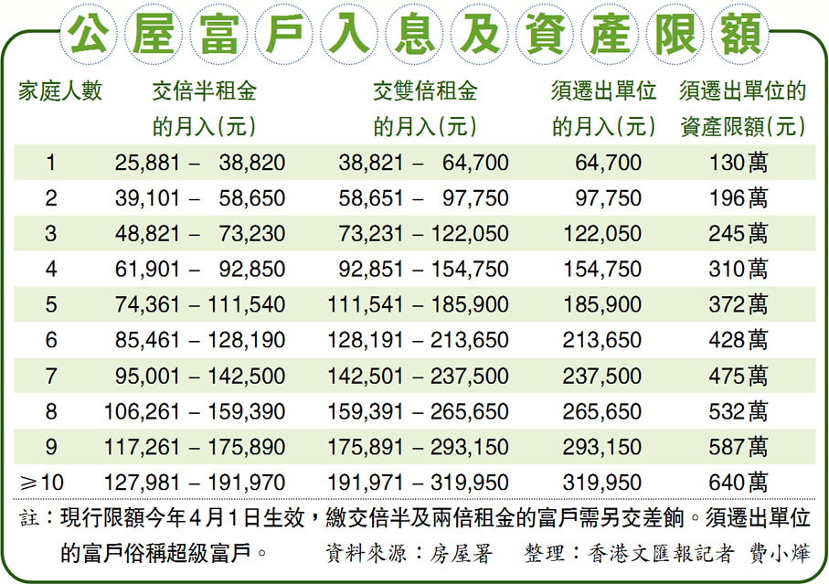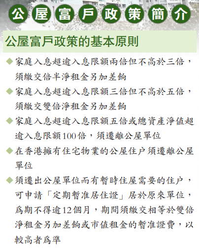 現行政策下,公屋租戶在入住10年後須申報入息及資產,隨後每兩年申報一次。若家庭每月入息超出限額5倍以內(俗稱富戶),需繳交倍半至雙倍的淨租金另加差餉;若入息超標5倍或資產超標100倍(俗稱超級富戶),房屋署將會發出遷出通知書,但可酌情批出「定期暫準居住證」,讓超級富戶以市值租金繼續暫住最多12個月,限期屆滿後,若入息或資產仍不符要求,就需立即遷走。據悉,現時有約80名持有暫住證的超級富戶。