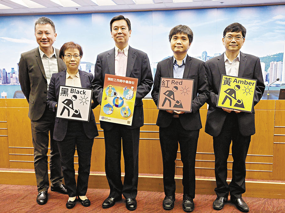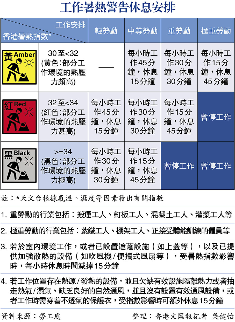 (香港文匯報記者 吳健怡、郭倩)極端天氣下,香港的酷熱天氣日數漸多,勞工處在炎夏來臨前宣布,《預防工作時中暑指引》將於下周一(15日)實施,「工作暑熱警告」將劃分為黃、紅、黑三級制,並將洗熨業、飲食業一併納入高危工種,再按不同崗位的勞動程度分為輕、中、重及極重四類。指引規定當暑熱警告生效時,各勞動工種從業員的工作和休息安排,例如黑色警告生效時,重及極重勞動崗位(如紮鐵、搬運工人)必須暫停工作,輕、中勞動崗位每小時分別休息30分鐘及45分鐘。該指引沒有法律效力,即使僱主沒遵從也無刑責,兩年後才檢視是否立法,但勞工處強調若出事,有證據顯示僱主沒做足措施,處方也會相應跟進。