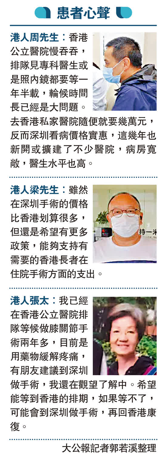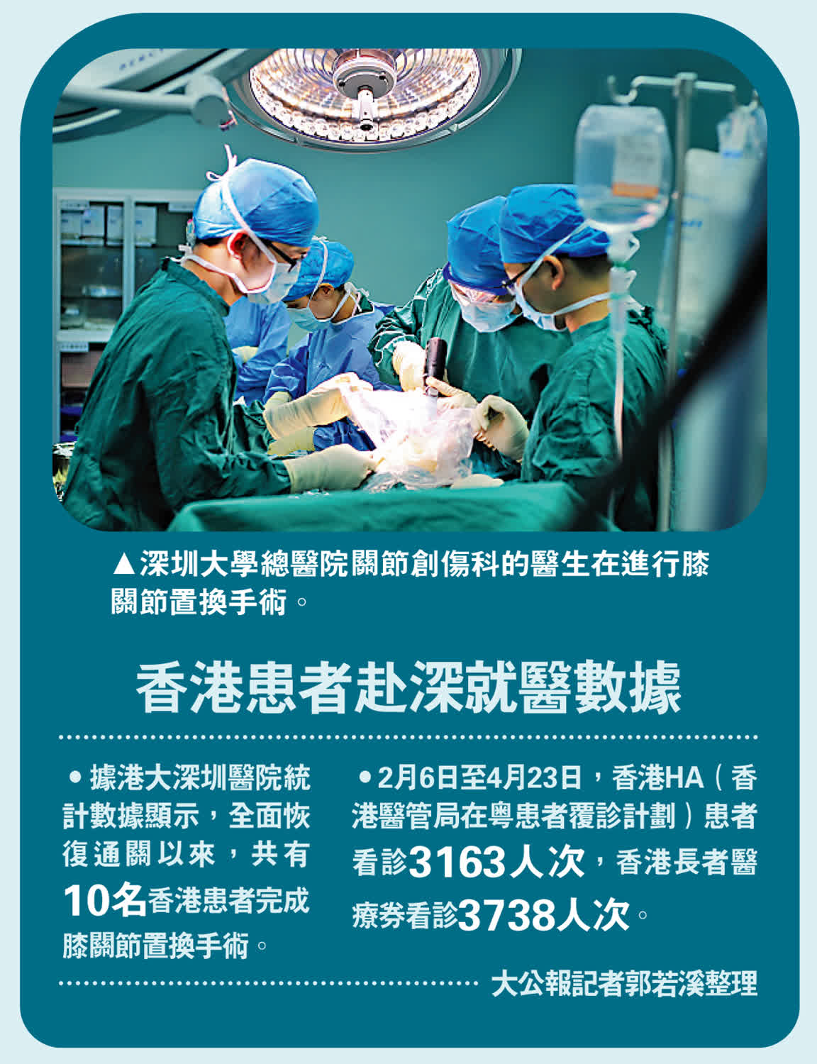 港人陳先生此前已在深圳成功完成關節置換手術。他表示,「現在北上就醫很方便,既能像香港私家醫院即刻做手術,價格也能負擔得起。」根據港大深圳醫院統計數據顯示,全面恢復通關以來,共有十名香港患者做膝關節置換手術;2月6日至4月23日,香港HA(香港醫管局在粵患者覆診計劃)患者看診3163人次,香港長者醫療券看診3738人次。
