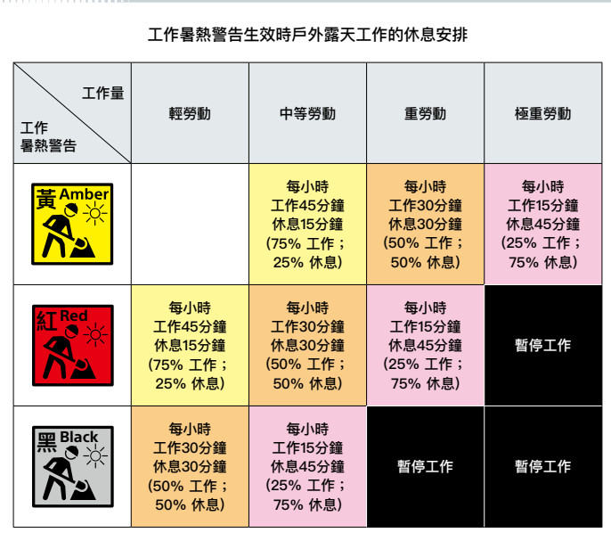 勞工處基於香港暑熱指數制定了三個級別的工作暑熱警告,包括黃色工作暑熱警告,表示部分工作環境的熱壓力頗高;紅色工作暑熱警告,表示部分工作環境的熱壓力甚高;黑色工作暑熱警告,表示部分工作環境的熱壓力極高。