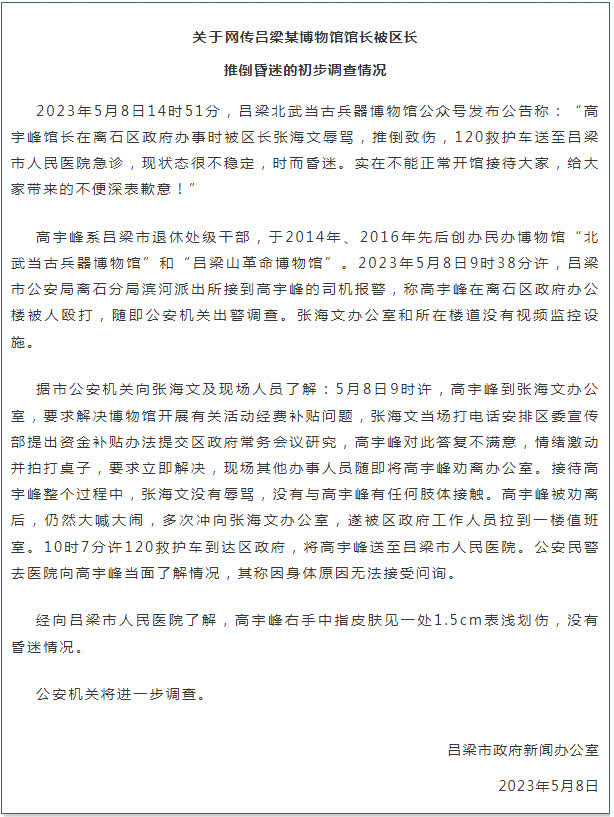 5月9日淩晨,山西省呂梁市政府新聞辦公室回應「網傳呂梁某博物館館長被區長推倒昏迷」稱,5月8日9時許,高宇峰到張海文辦公室,要求解決博物館開展有關活動經費補貼問題。接待高宇峰整個過程中,張海文沒有辱罵,沒有與高宇峰有任何肢體接觸。經向呂梁市人民醫院了解,高宇峰右手中指皮膚見一處1.5cm表淺劃傷,沒有昏迷情況。