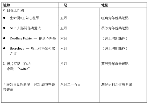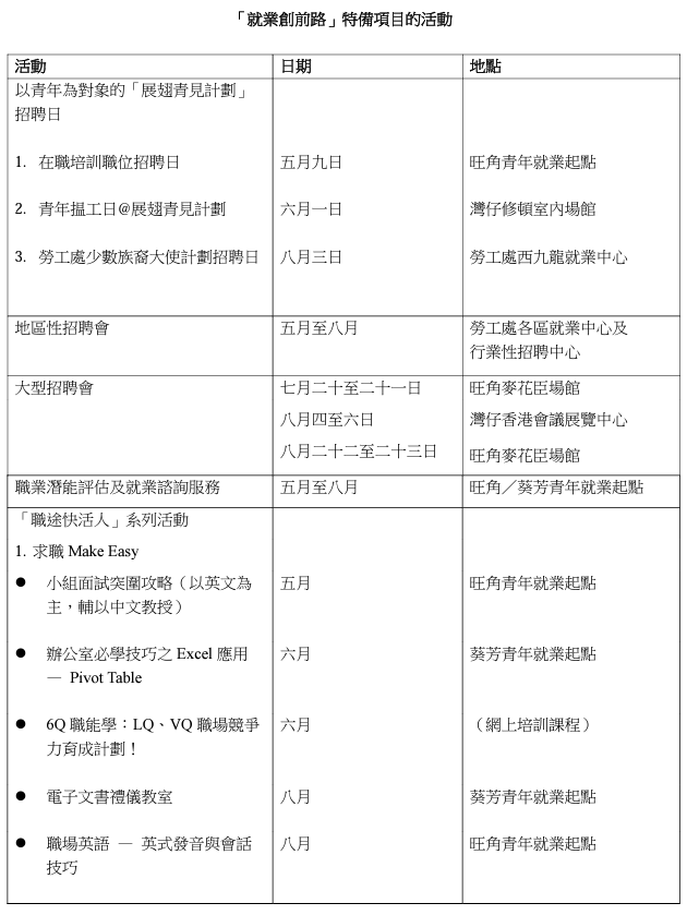 發言人指,為協助畢業生裝備自己,提升求職面試技巧及認識正確的工作價值觀,勞工處兩所位於旺角和葵芳的青年就業資源中心「青年就業起點」推出「職途快活人」系列活動,舉辦一系列實用培訓課程。「青年就業起點」同時提供職業潛能評估及就業諮詢服務,讓畢業生及早規劃職業生涯。