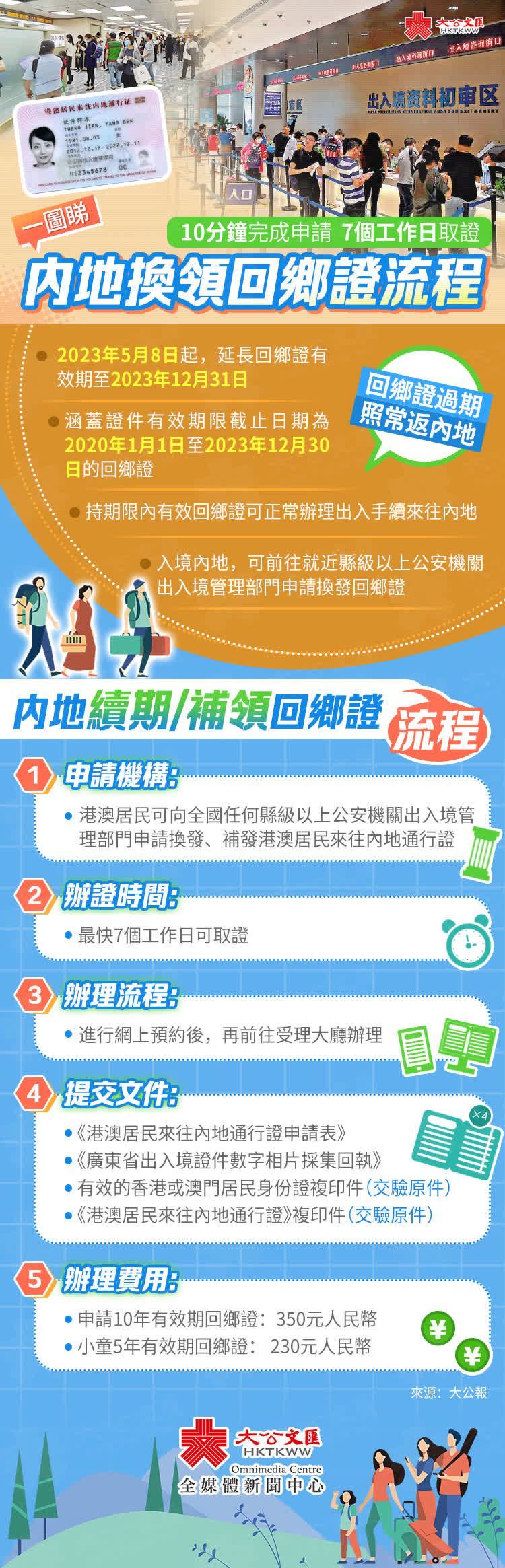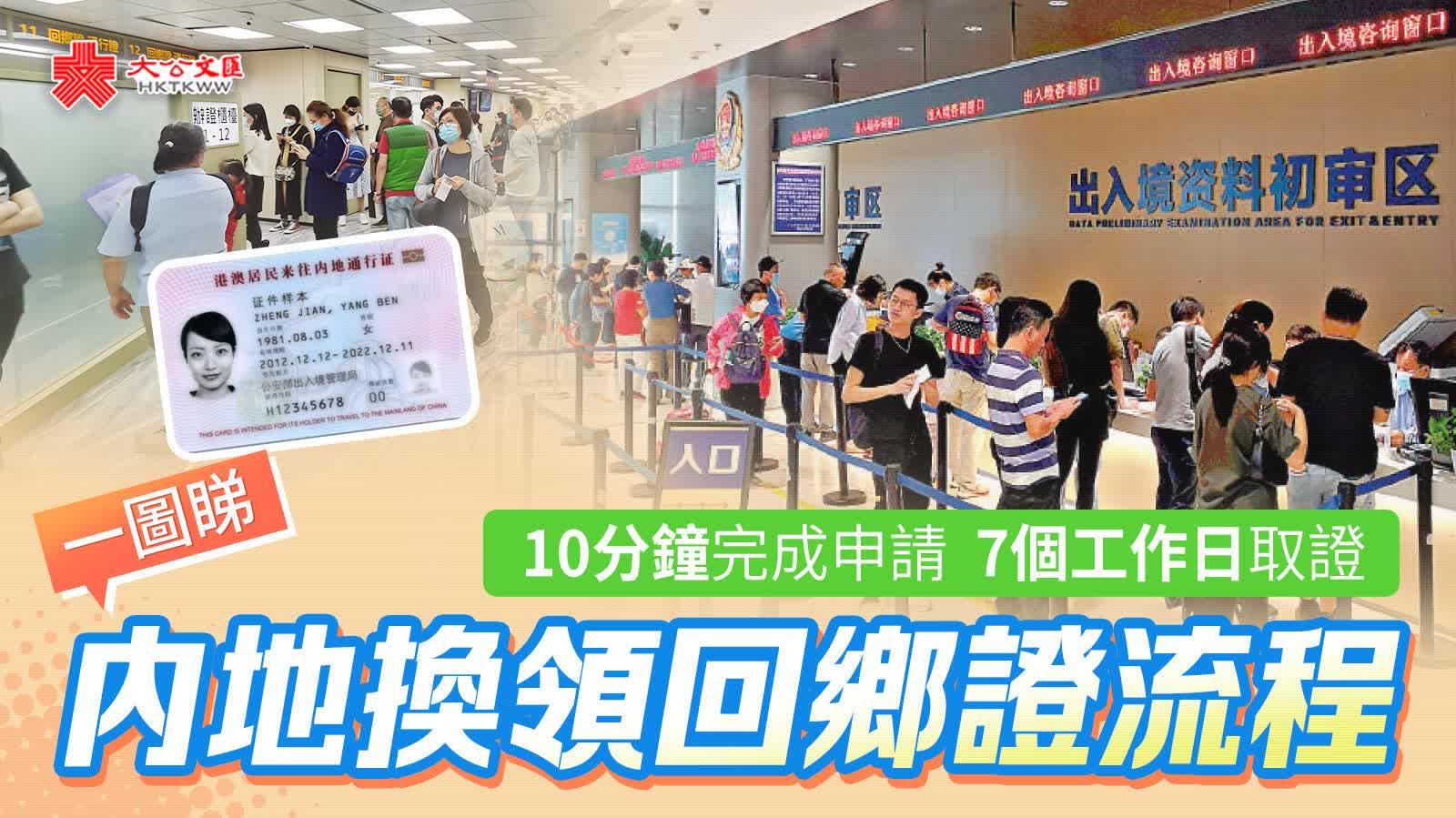大公文匯全媒體報道,因應三年疫情,回鄉證過期的港人注意啦!自5月8日起,延長2020年及之後到期的回鄉證,即港澳居民來往內地通行證的有效期延長至今年年底。5月8日是政策實施第一天,大公報記者在多地出入境大廳看到,當日辦理回鄉證換證的港澳居民不多,大概十分鐘就能辦完一個業務,七個工作日後可取證。港人如何在內地換領回鄉證?流程有哪些?快來一圖睇清!(點此預約在深圳換領回鄉證)