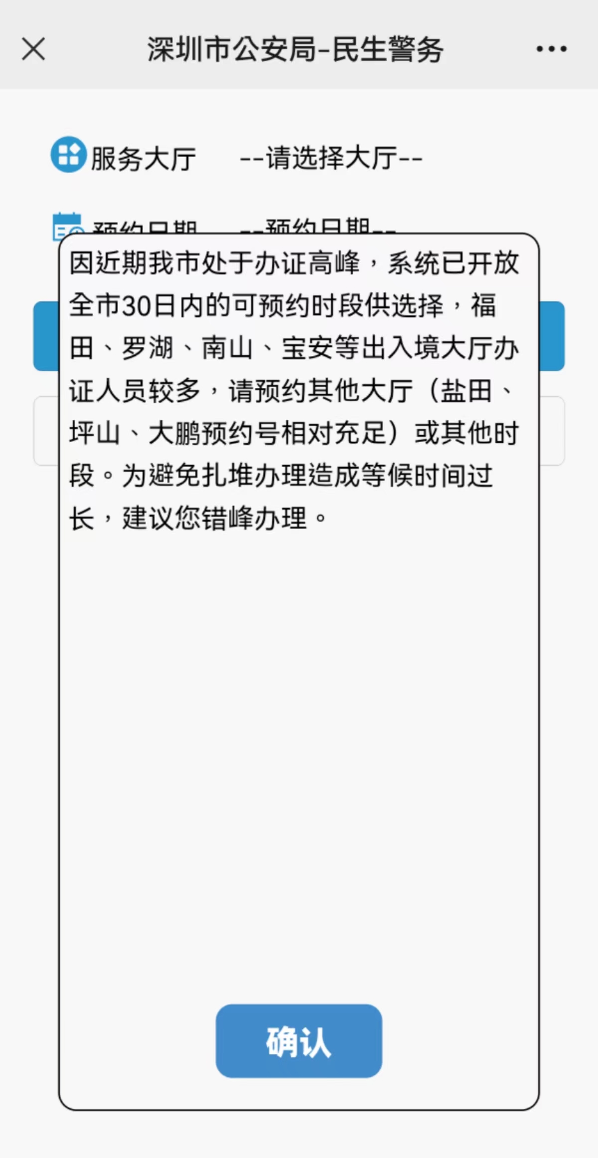 深圳公安官網提示,因近期深圳處於辦證高峰,系統已開放全市30日內的可預約時段供選擇,福田、羅湖、南山、寶安等出入境大廳辦證人員較多,請預約其他大廳(鹽田、坪山、大鵬預約號相對充足)或其他時段。