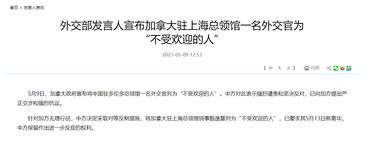 加拿大政府基於個別政客和媒體所謂「中國干涉加內政」的謊言,公然宣布中國駐多倫多總領館一名領事官員為「不受歡迎的人」,要求其限期離境。外交部發言人今日(9日)表示,針對加方無理行徑,中方決定採取對等反制措施,將加拿大駐上海總領館領事甄逸慧列為「不受歡迎的人」,已要求其5月13日前離華。中方保留作出進一步反應的權利。