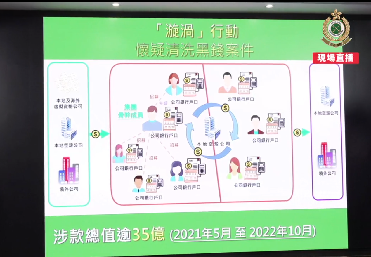 海關今日(9日)交代案情指,自去年年中鎖定一名54歲本地女子,懷疑她利用名下公司銀行戶口清洗黑錢。經連月追查及分析資金流向,海關再鎖定3男1女本地人,當中包括該洗黑錢集團的一名男骨幹成員及其妻子。該名男子涉嫌招攬其妻子及另外1男2女,在2021年5月至2022年10月期間,透過名下逾100間,報稱為貿易、電子產品等業務的空殼公司戶口,處理逾2000宗大額可疑交易,涉案款項約35億港元。海關於4月26日至5月3日展開拘捕行動,拘捕上述涉案的4男4女,年齡介乎24至68歲。