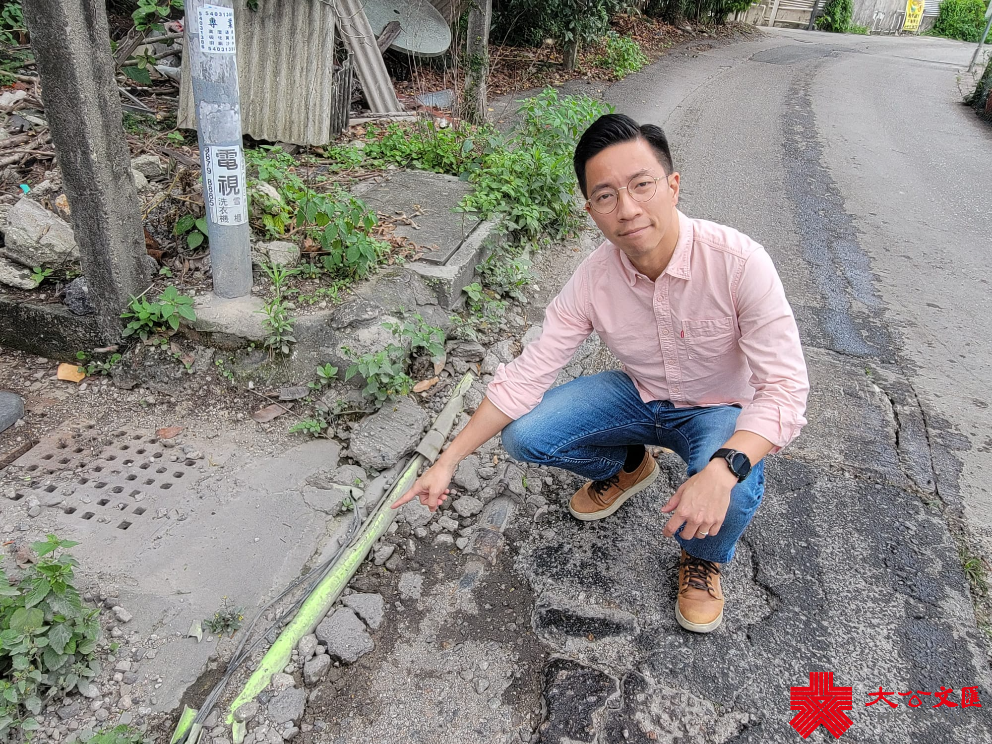 談及打風落雨網絡差的問題,侯先生帶記者到門外看村內網線喉管,只見網線喉管與路面距離十分近,喉管的邊沿亦未有封口,網線喉管經過去水渠又沒有足夠保護,只是加少量石屎勉強包住了事,侯先生懷疑網線鋪設工程時質素差,令網線受損,影響上網的穩定性。