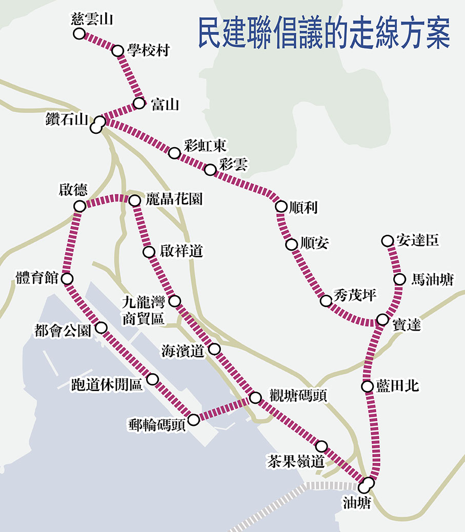 民建聯建議,在「高架無軌捷運系統」彩虹至寶達走線之上,新設一個位於鑽石山的車站,通過地下通道與現時的鑽石山站連接,並接駁至慈雲山、學校村、富山、馬油塘、安達臣(總站)。